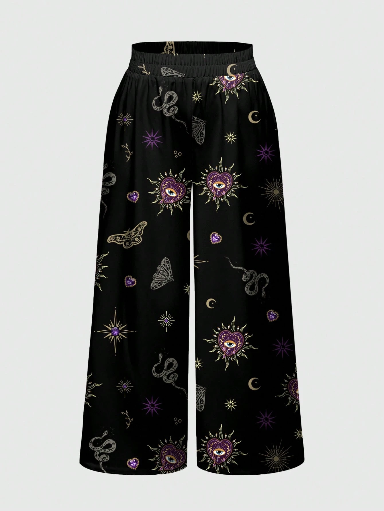 Goth Pantalon ample à jambes larges de style vintage avec imprimé intégral de motifs de scorpion, soleil, lune, étoiles, chauve-souris, papillon, serpent, papillon de nuit, cœur, œil pour grande taille
