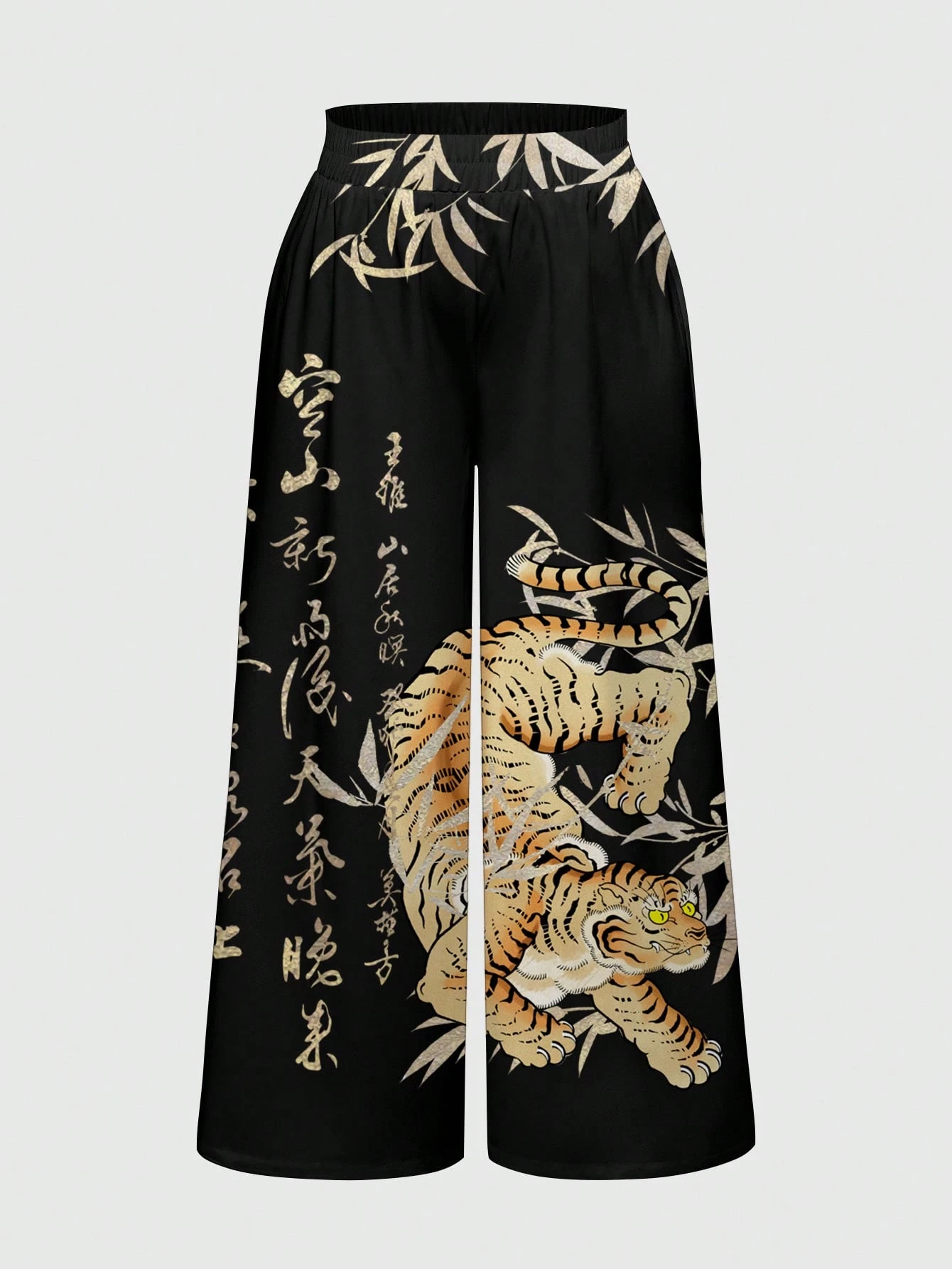 ROMWE Avant Nouveau pantalon large à jambes larges de style chinois avec imprimé intégral, style calligraphie tigre, punk, festival de musique, grande taille
