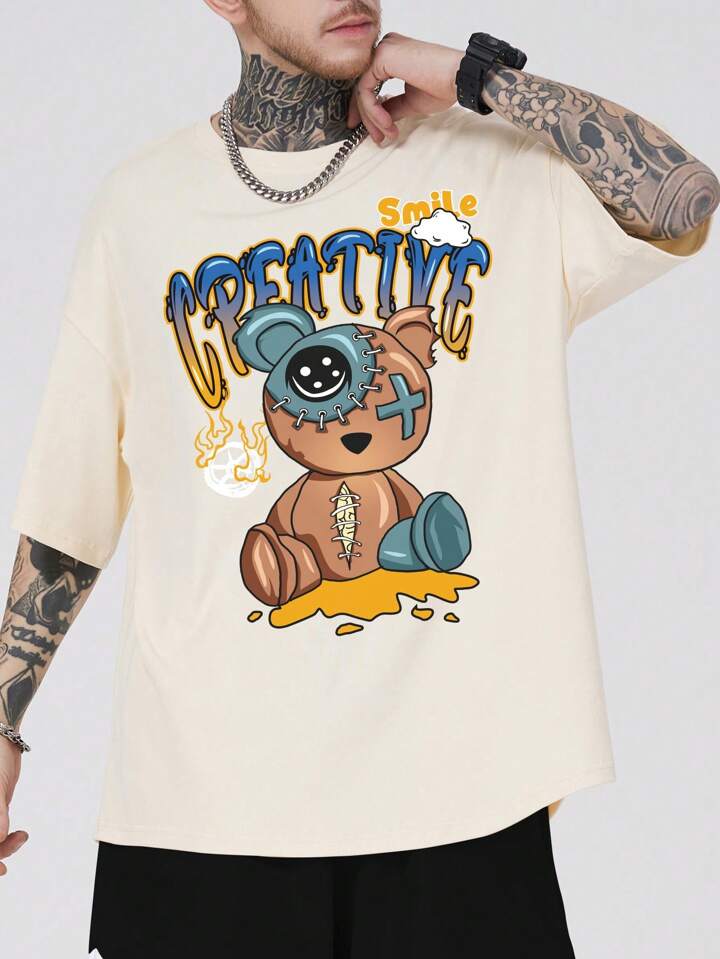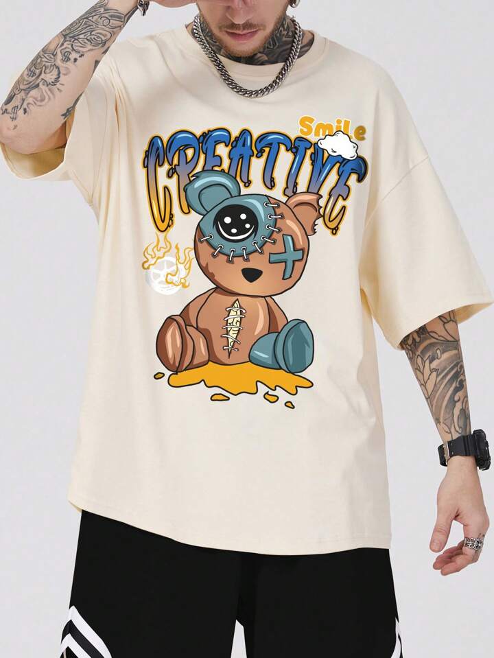 Street Life T-shirt à manches tombantes avec graphique d'ours et de lettres, pour école
