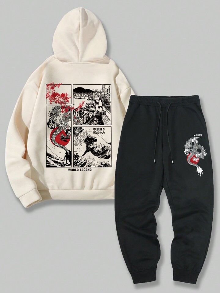 Street Life Hommes Lettre Sweat-shirt À Capuche Graphique Dragon Chinois & Pantalon De Survêtement À Cordon De Serrage À La Taille