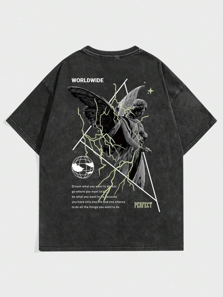 Street Life T-shirt D'épaule Tombante Imprimé Sculpture Vintage Pour Homme, Lavage À La Neige