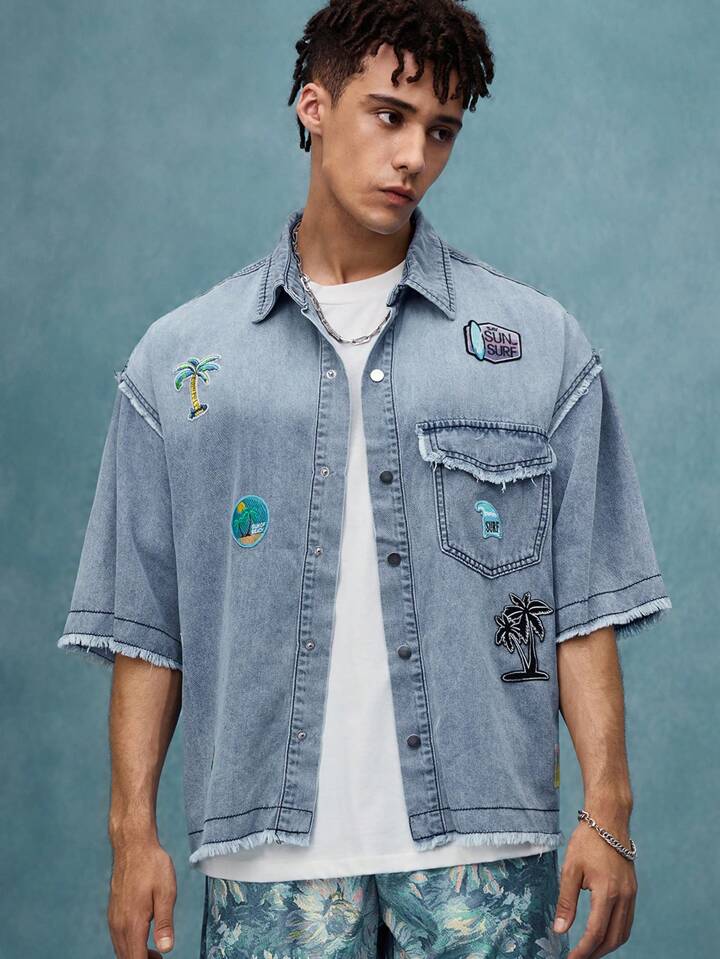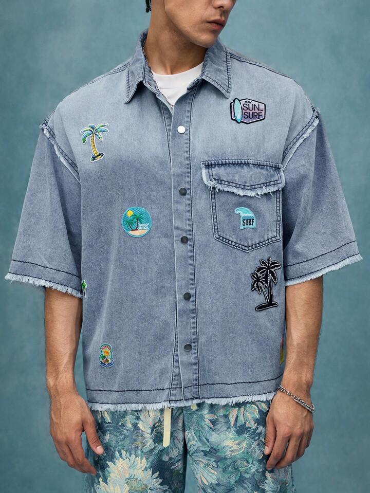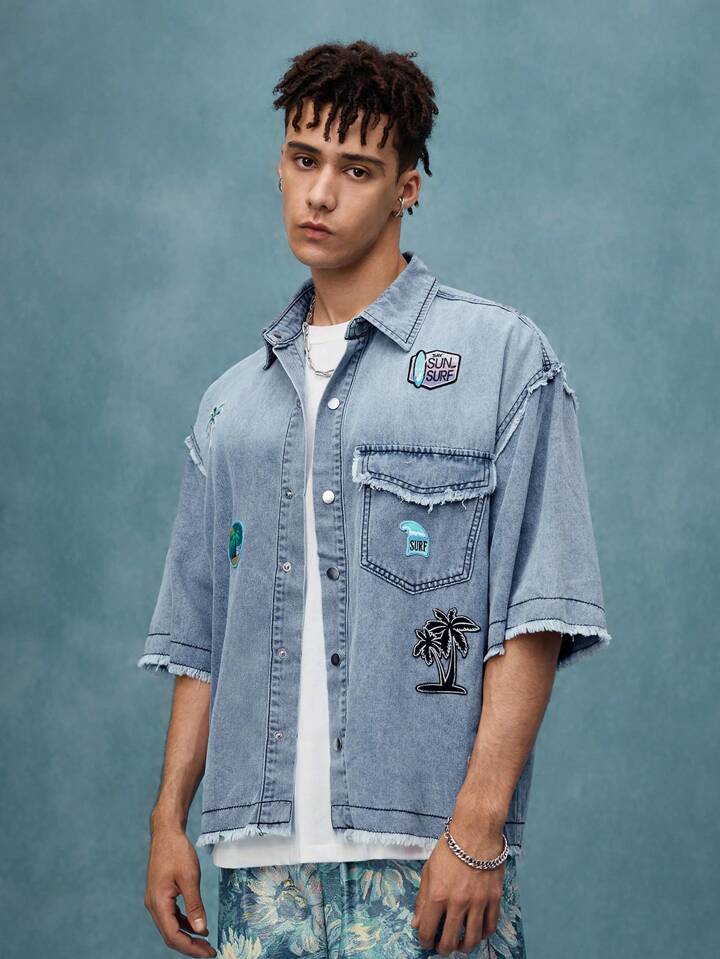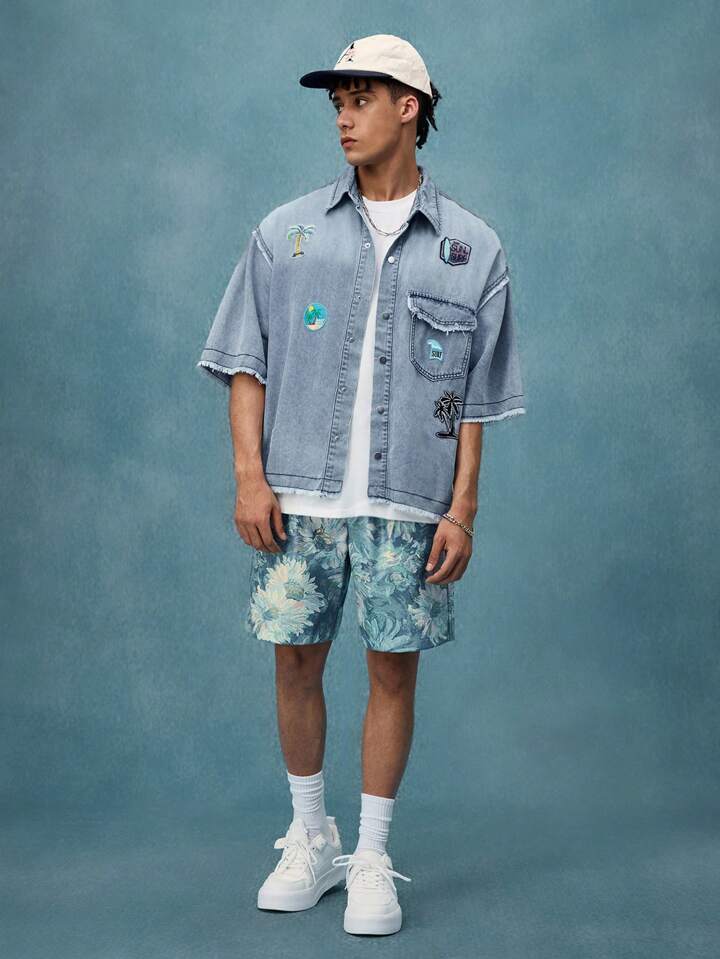 Street Life Top en denim imprimé coupe boîte pour homme, chemise en denim à manches courtes