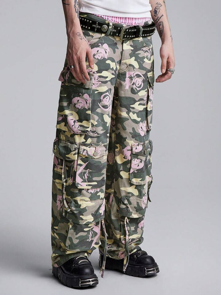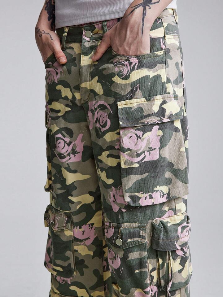 Street Life Jeans cargo droits décontractés à poches multiples avec imprimé camouflage et floral pour hommes