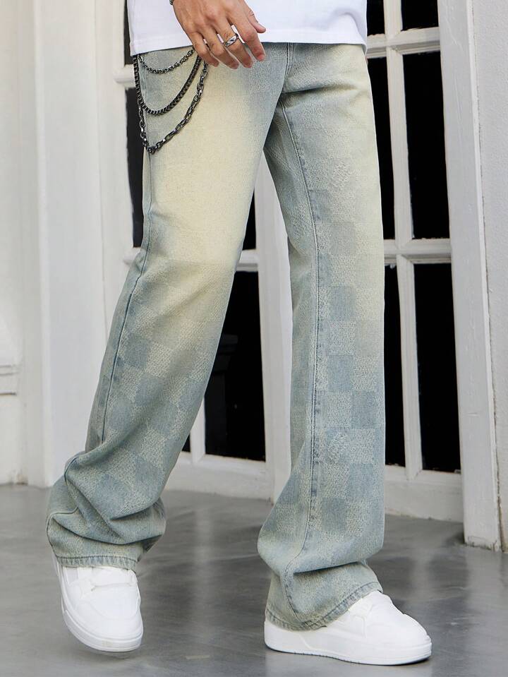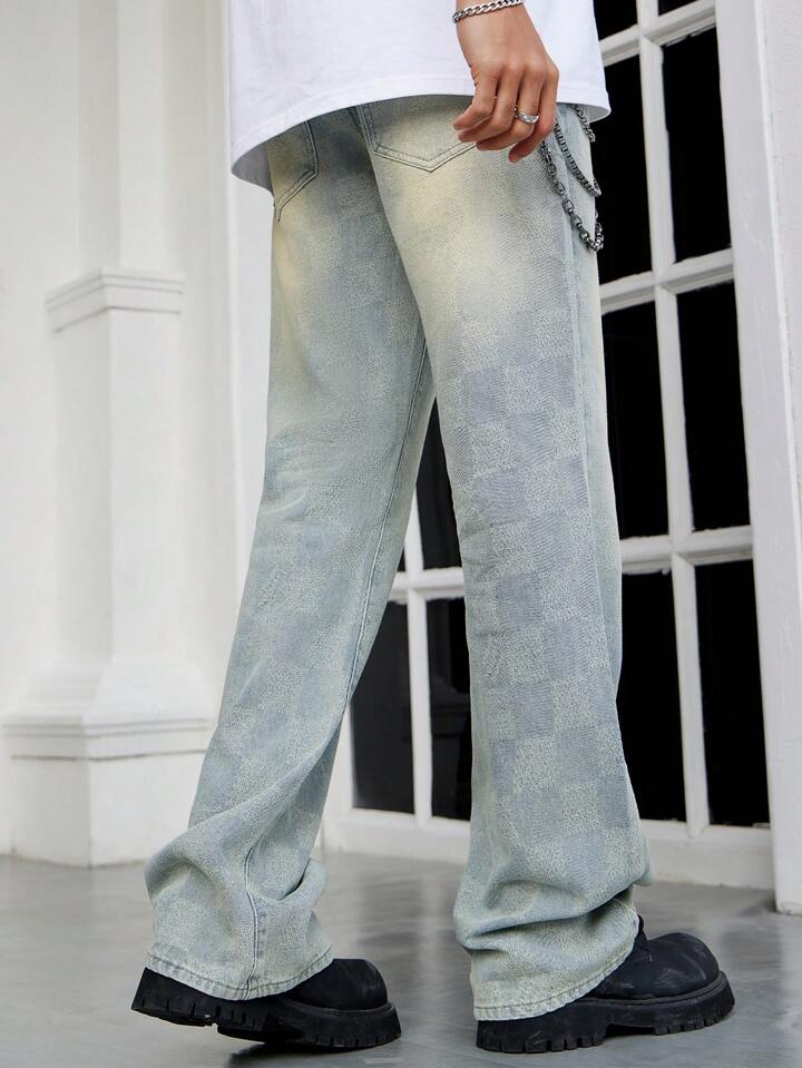 Street Life Jeans décontractés pour hommes à jambes évasées et motif à carreaux lavés