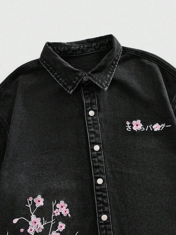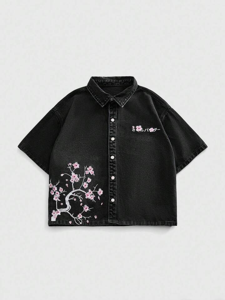 Street Life Chemise en jean ample à imprimé fleurs de cerisier japonaises, style décontracté pour le quotidien, les trajets et les vacances. Été.
