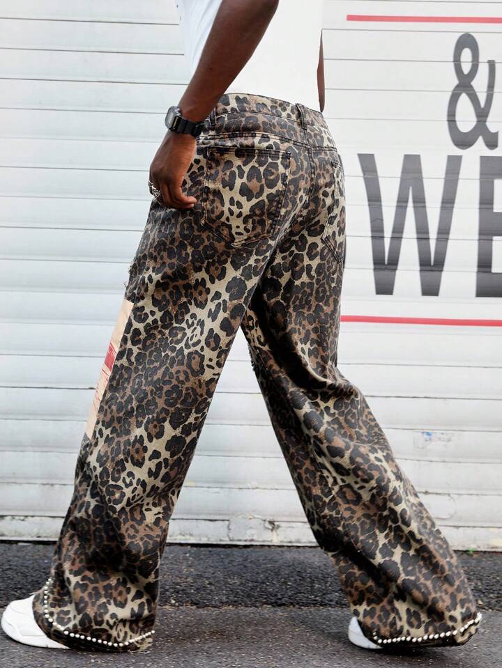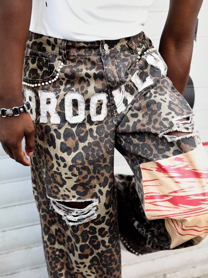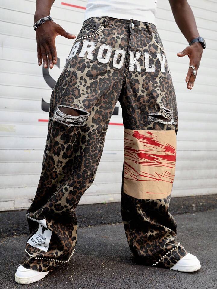 Street Life Jeans décontractés quotidiens pour hommes avec imprimé léopard, broderie de lettre et coupe ample et décontractée