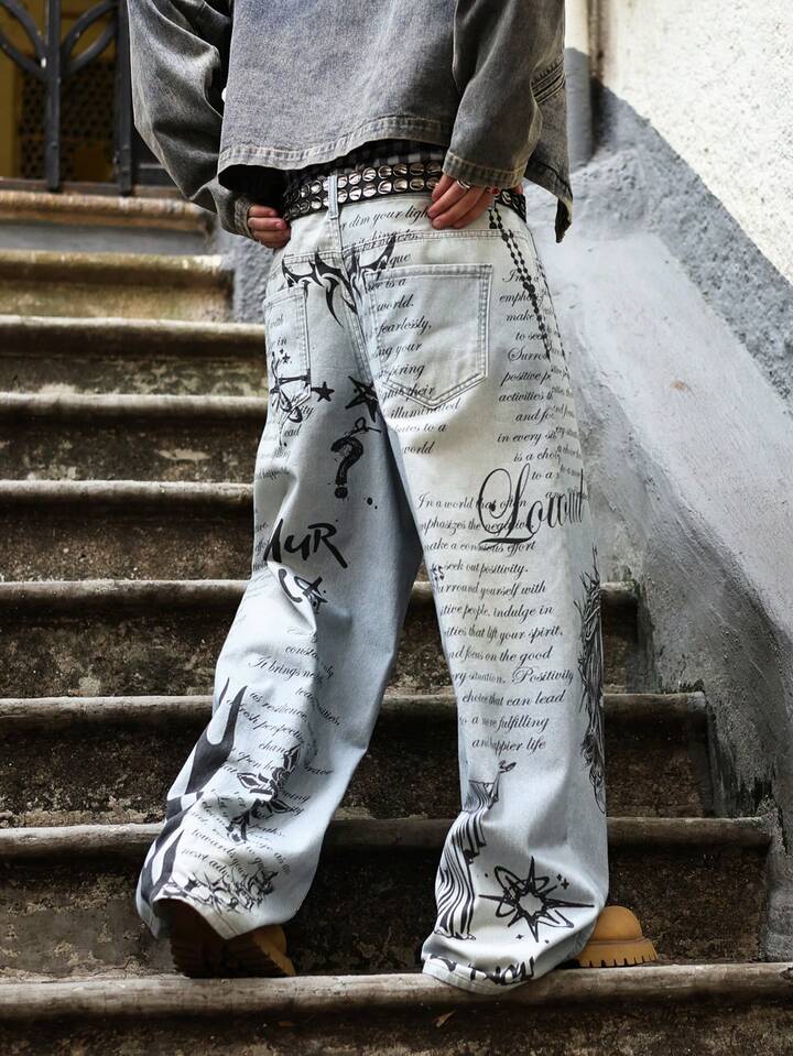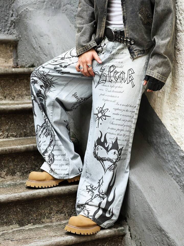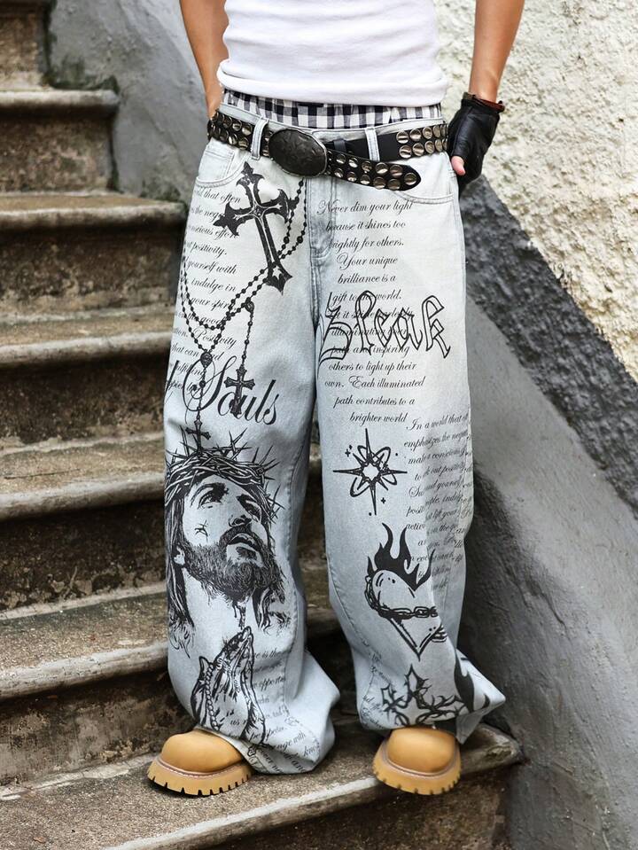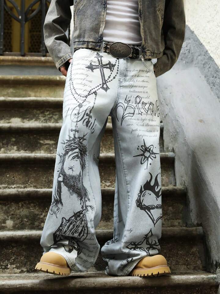 Street Life Jeans décontractés de mode de rue pour hommes, lavage clair, jambes larges et amples, imprimé slogan Jésus et croix. Ceinture non incluse
