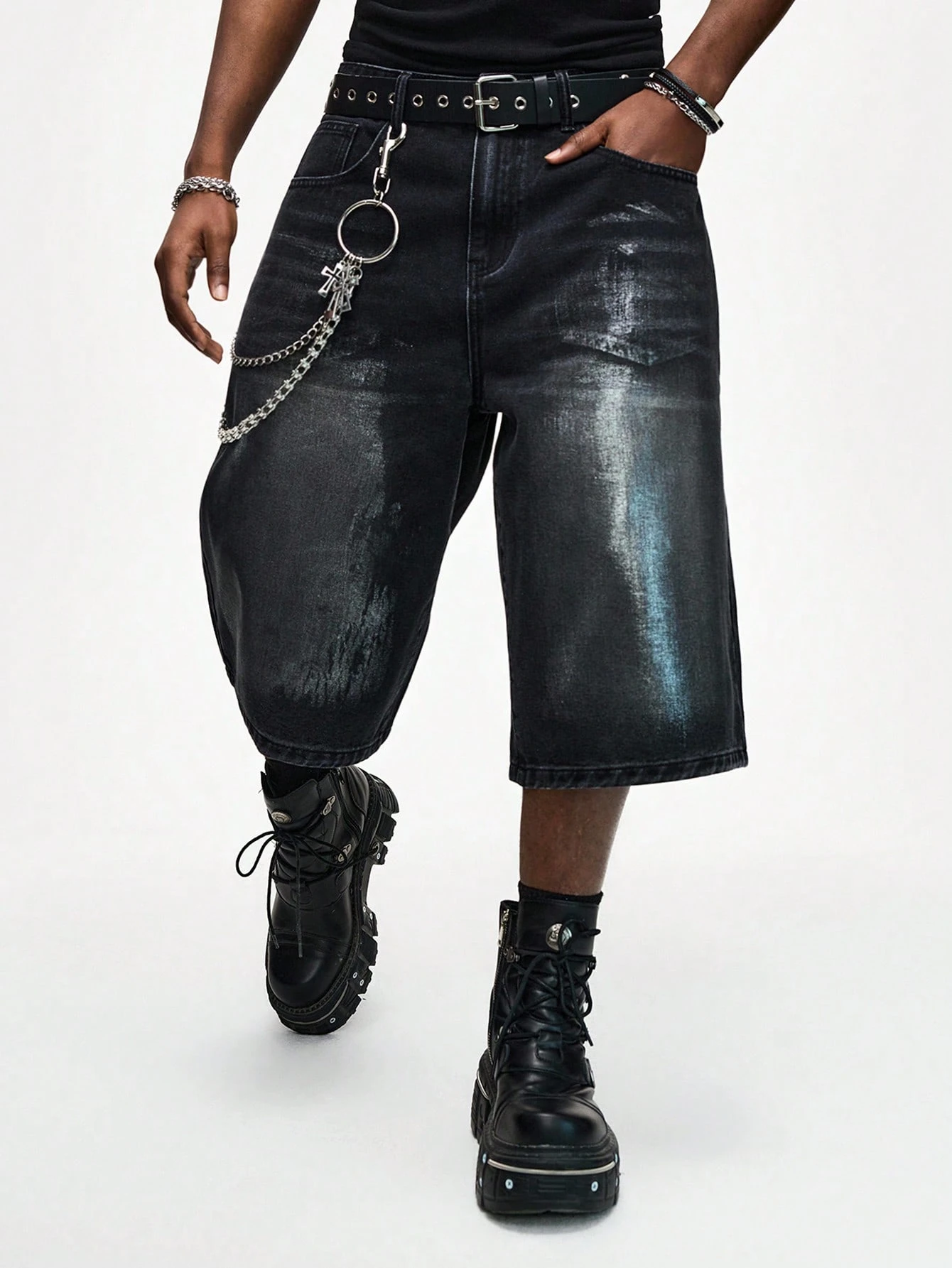 Street Life Short en jean homme décontracté, coupe large, teinture pulvérisée, longueur 7/10, sans ceinture à chaîne
