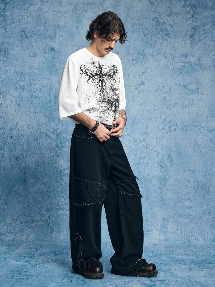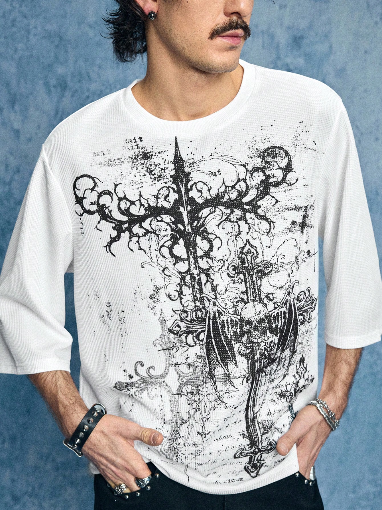 Street Life T-shirt casual ample à col rond et manches 3/4 pour hommes avec imprimé croix à ailes sombres