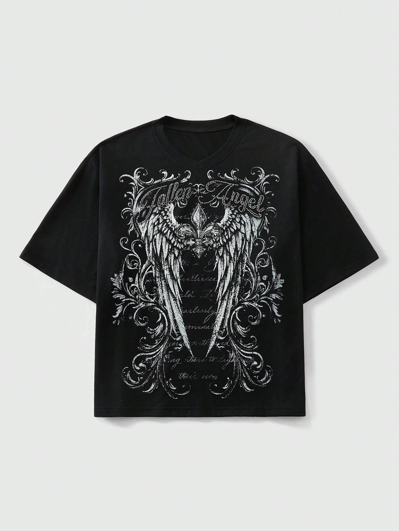 Street Life T-shirt casual pour hommes avec lettres et motif d'ailes en strass