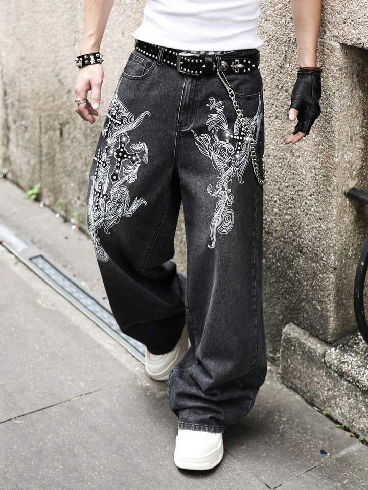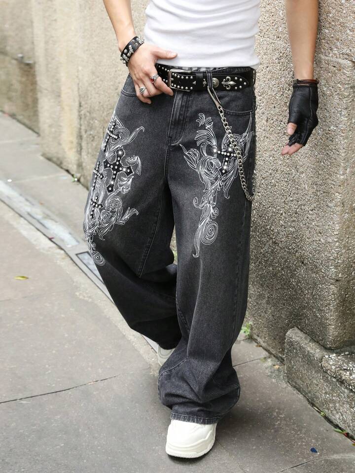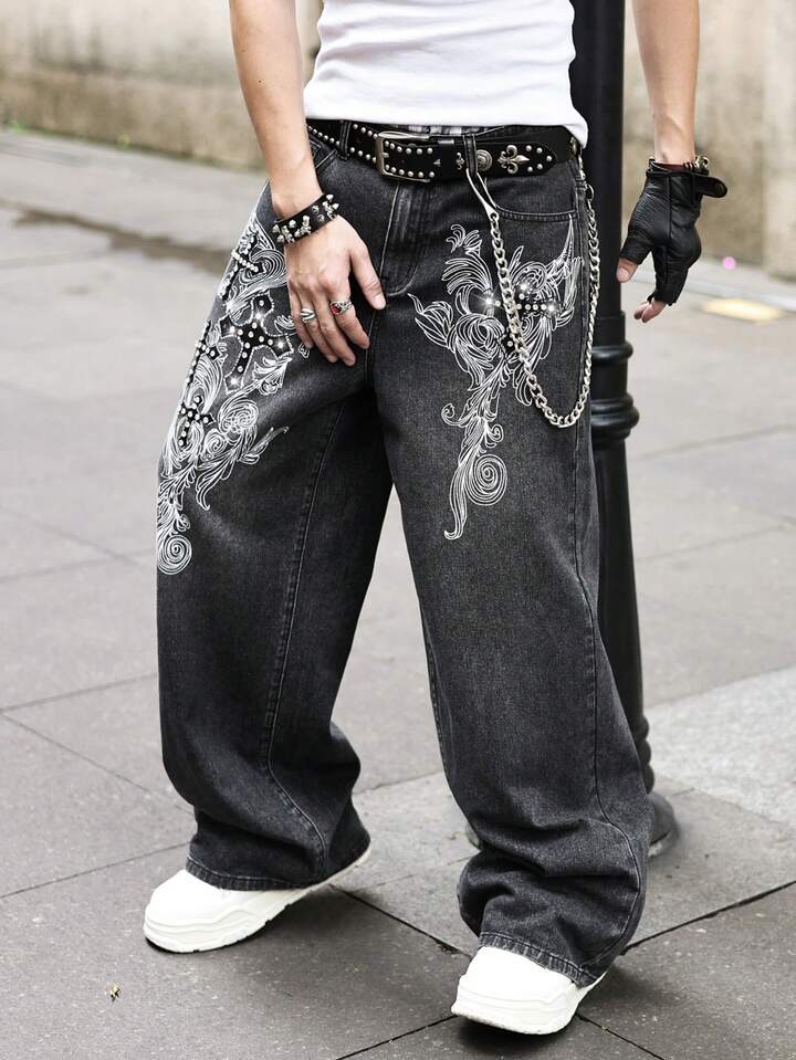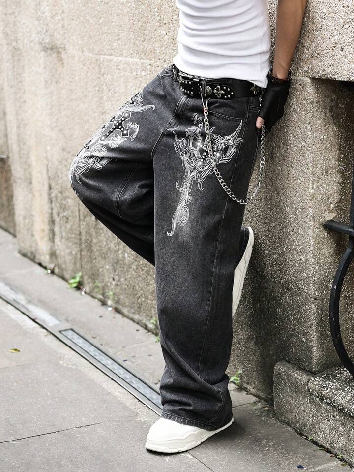 Street Life Jeans en denim imprimé, coupe ample, style décontracté de rue pour hommes