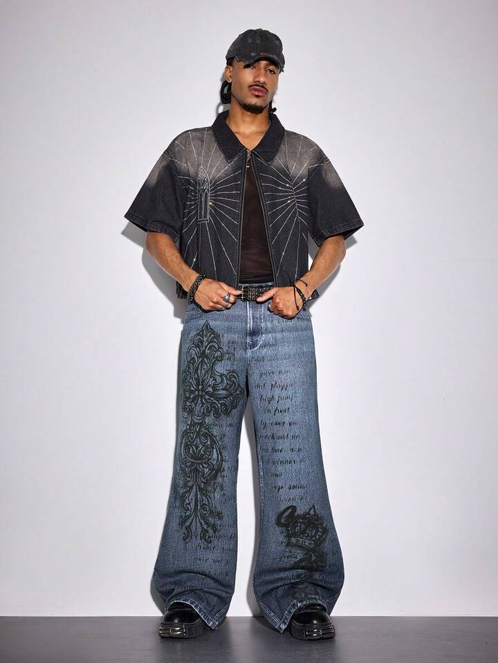 Street Life Jeans en denim délavé avec impression du logo croix, style décontracté pour hommes