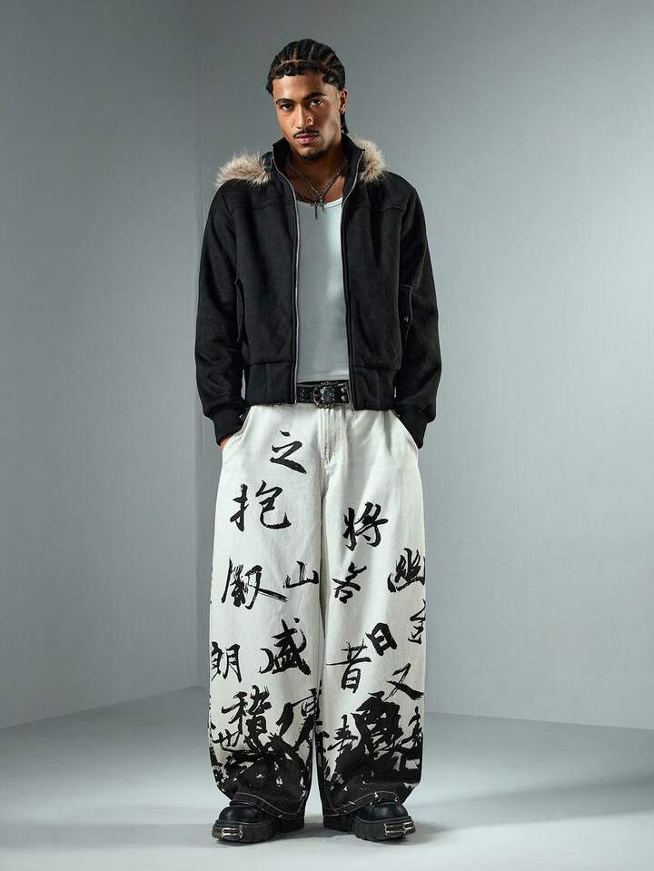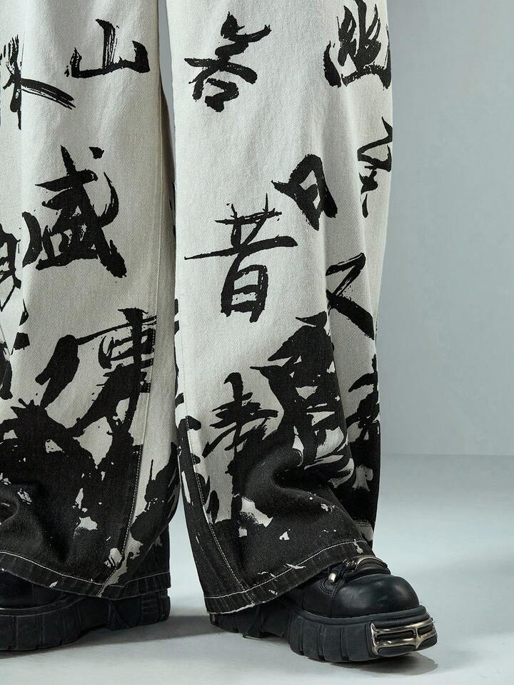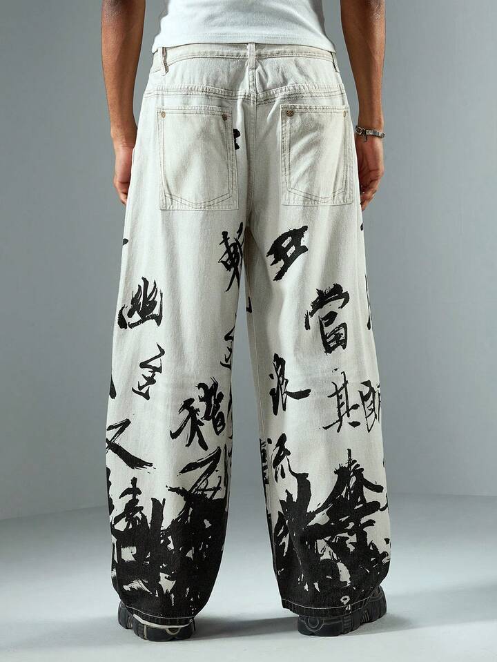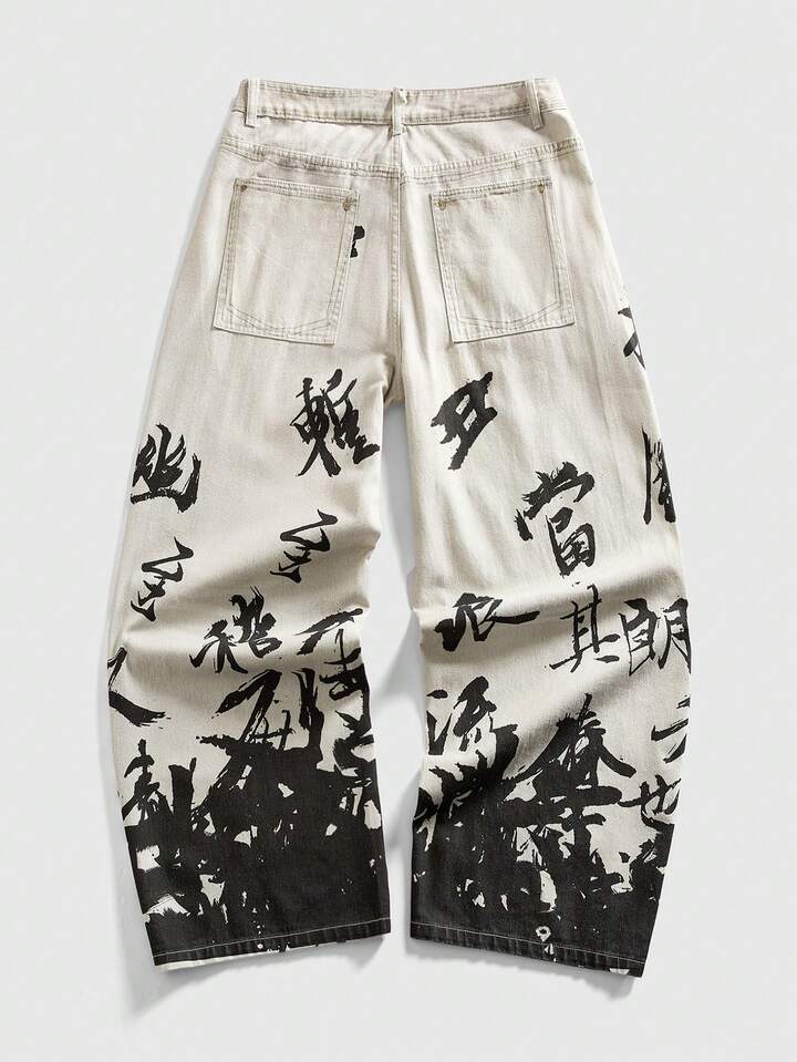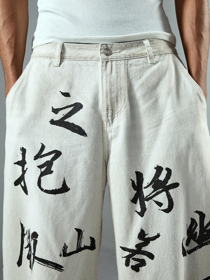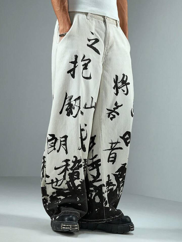 Street Life Jeans patchwork à imprimé numérique de caractères chinois pour hommes