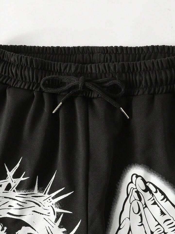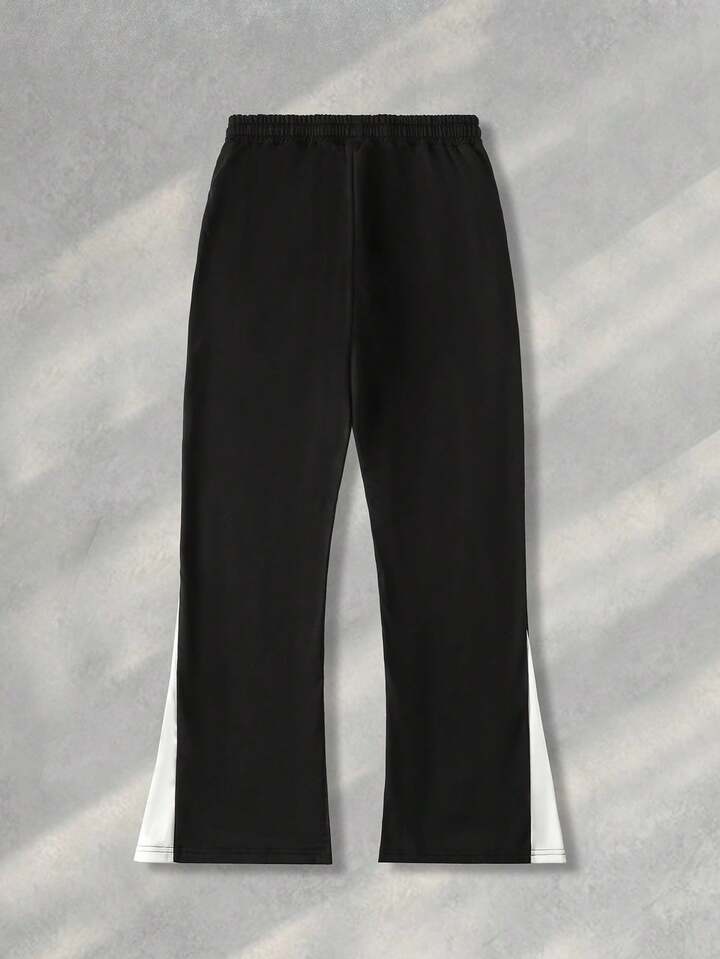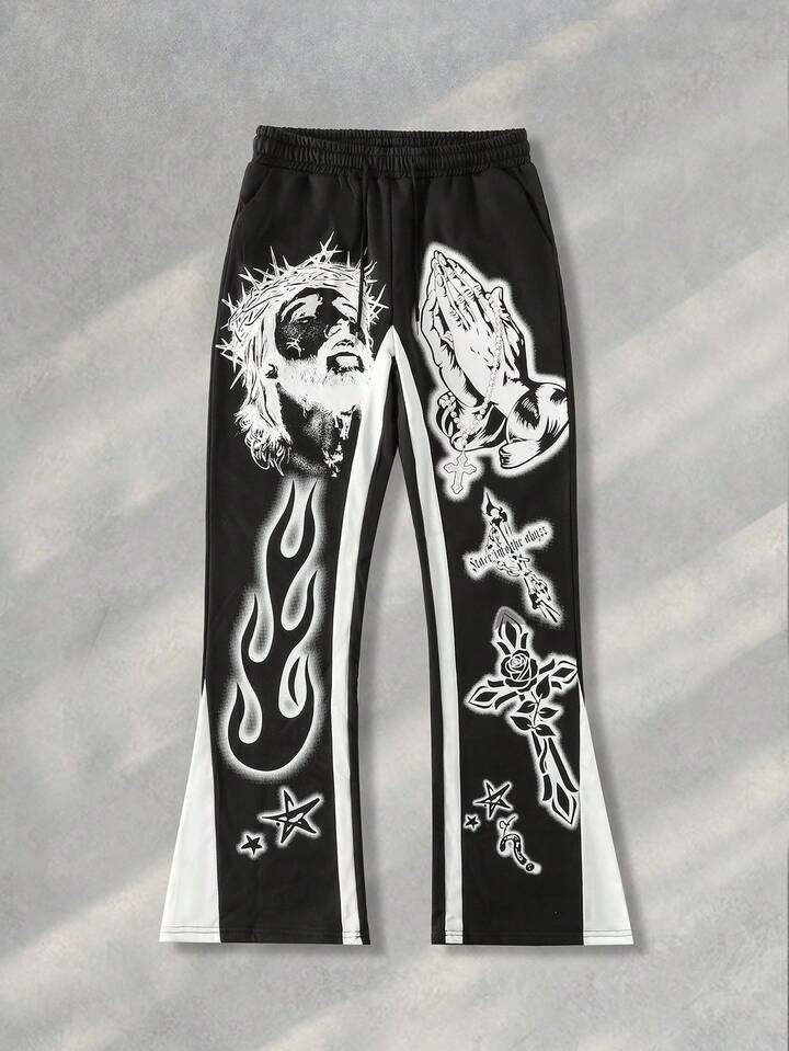 Street Life Pantalon de survêtement évasé pour hommes avec patchwork de couleurs contrastées et imprimé de geste de la main croisée, streetwear
