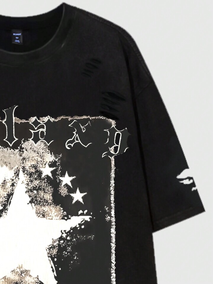 Street Life T-shirt imprimé étoile à cinq branches délavé pour hommes, convient pour le port quotidien au printemps et en été, école
