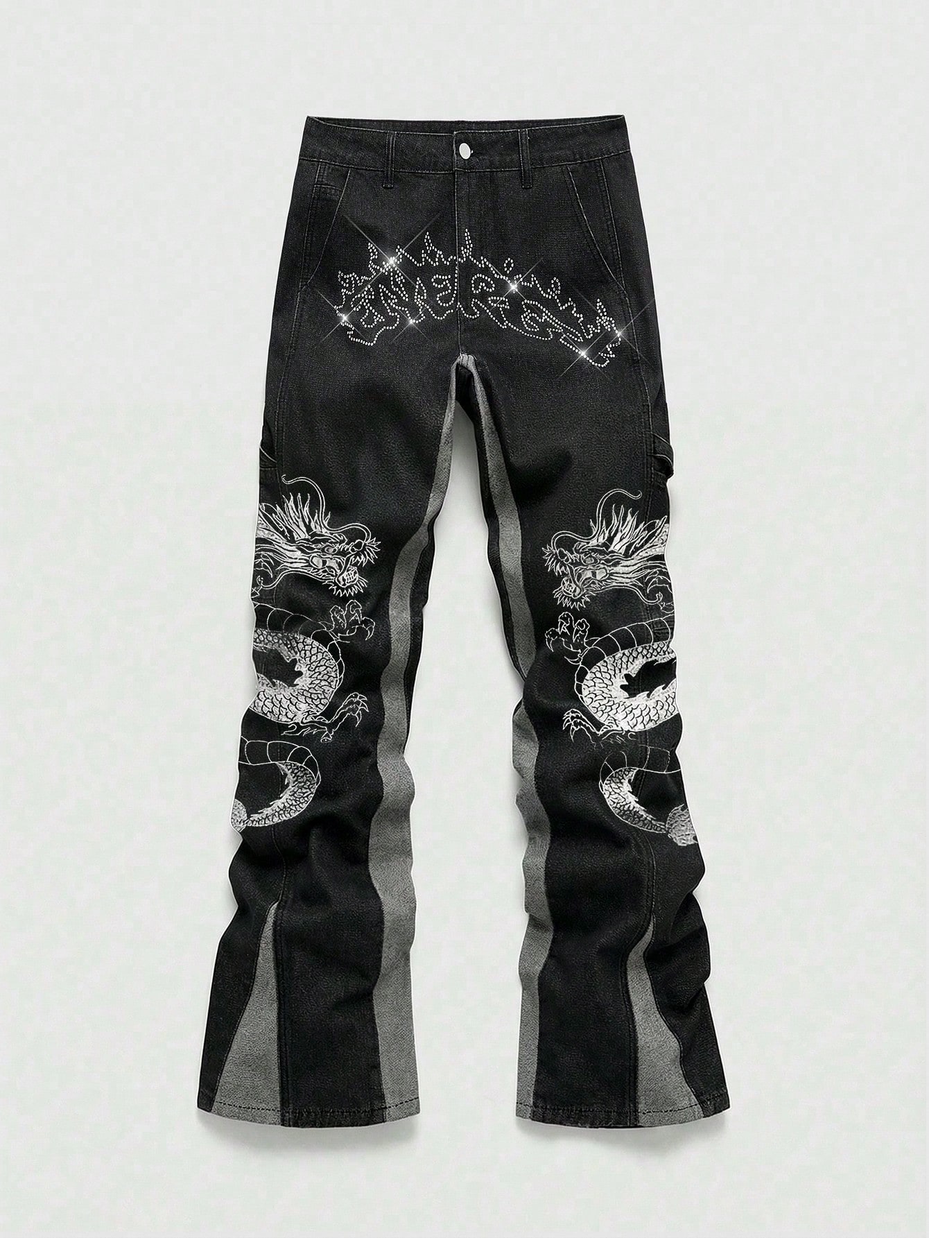 Street Life Jeans évasés à empiècement contrasté avec broderie de dragon pour hommes