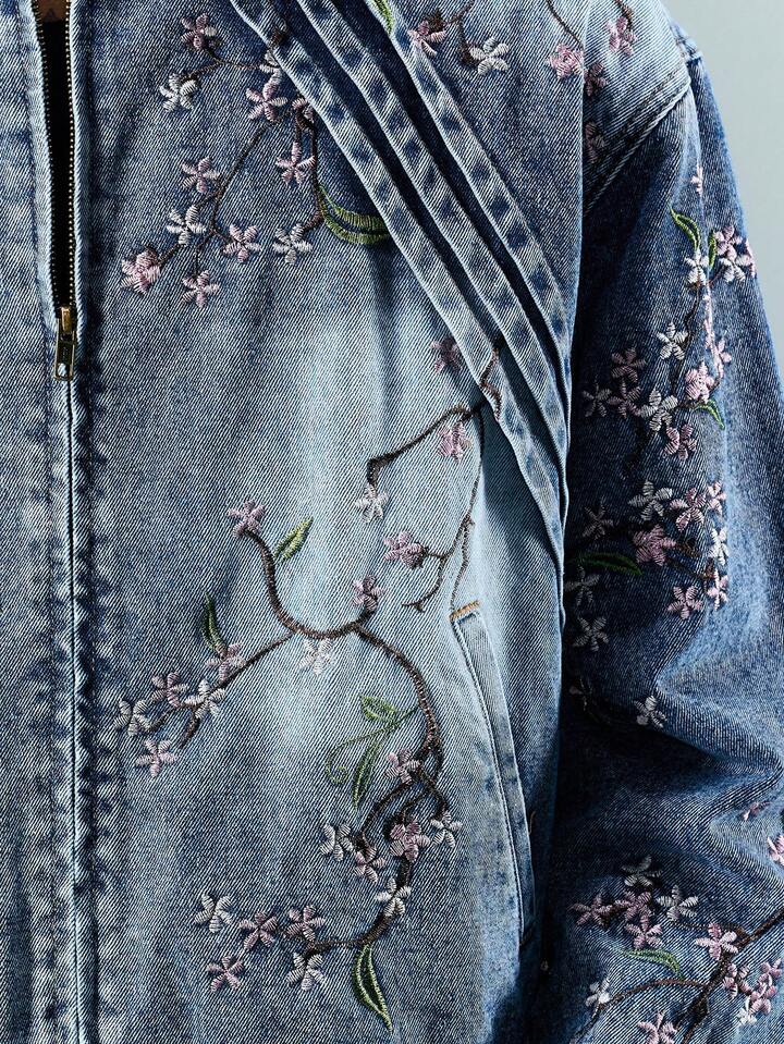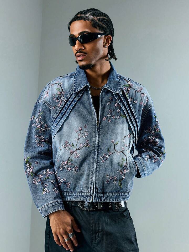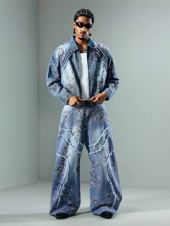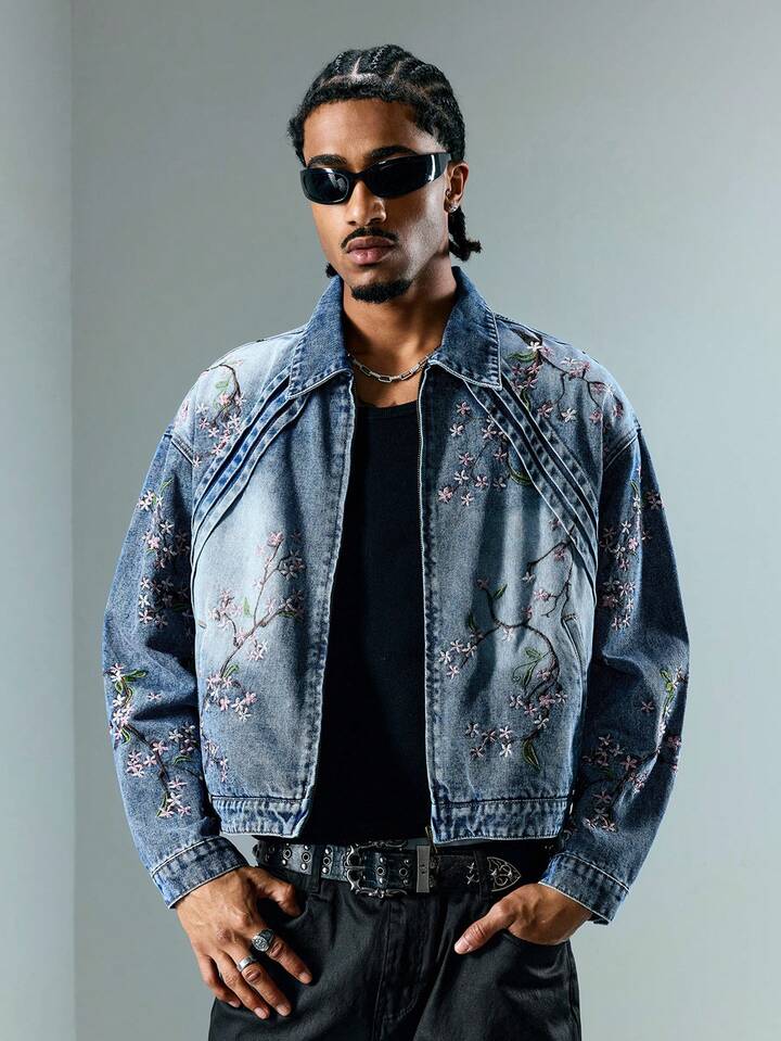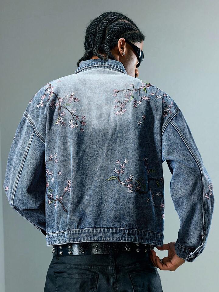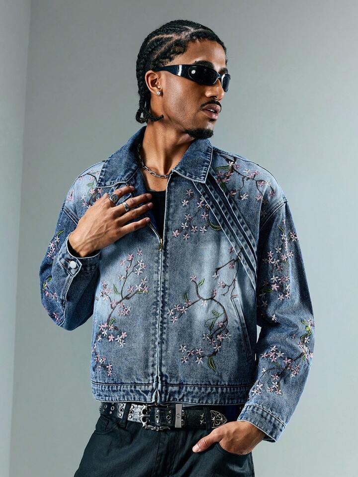 Street Life Veste en jean décontractée polyvalente à manches longues et encolure brodée pour hommes