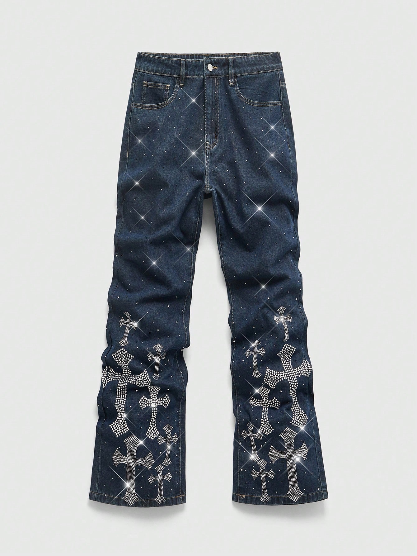 Street Life Jeans en denim avec ornements de strass en forme de croix pour hommes