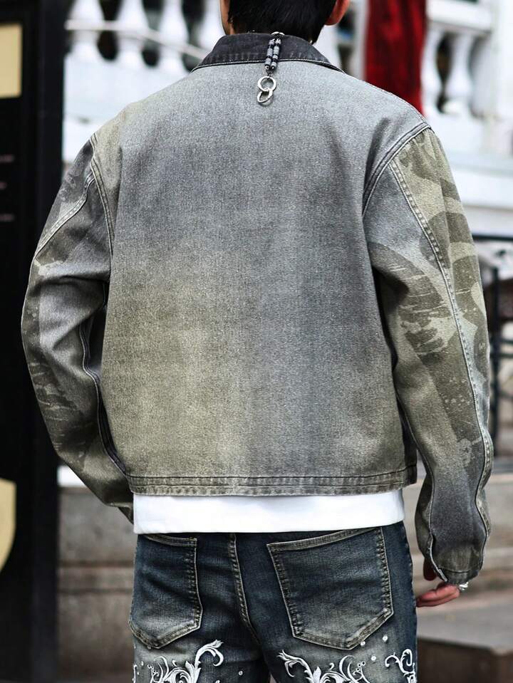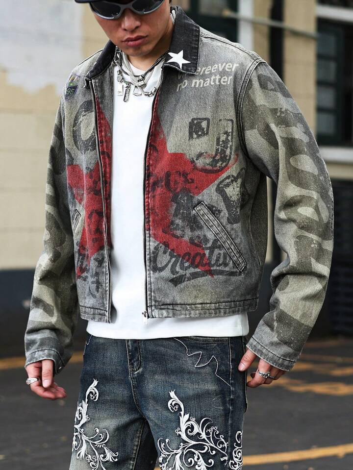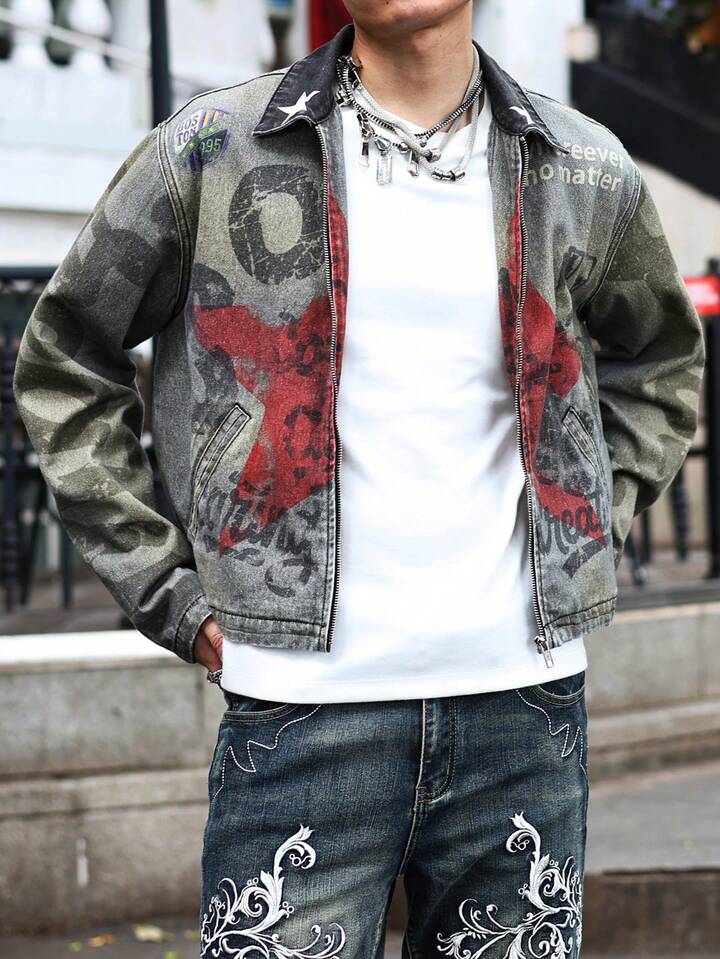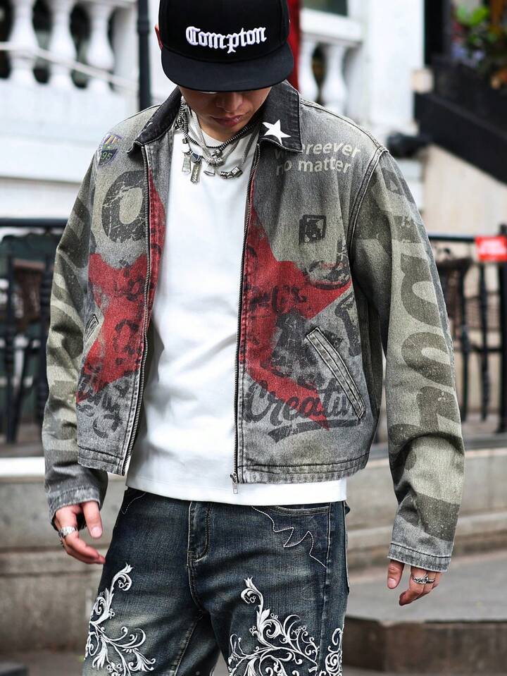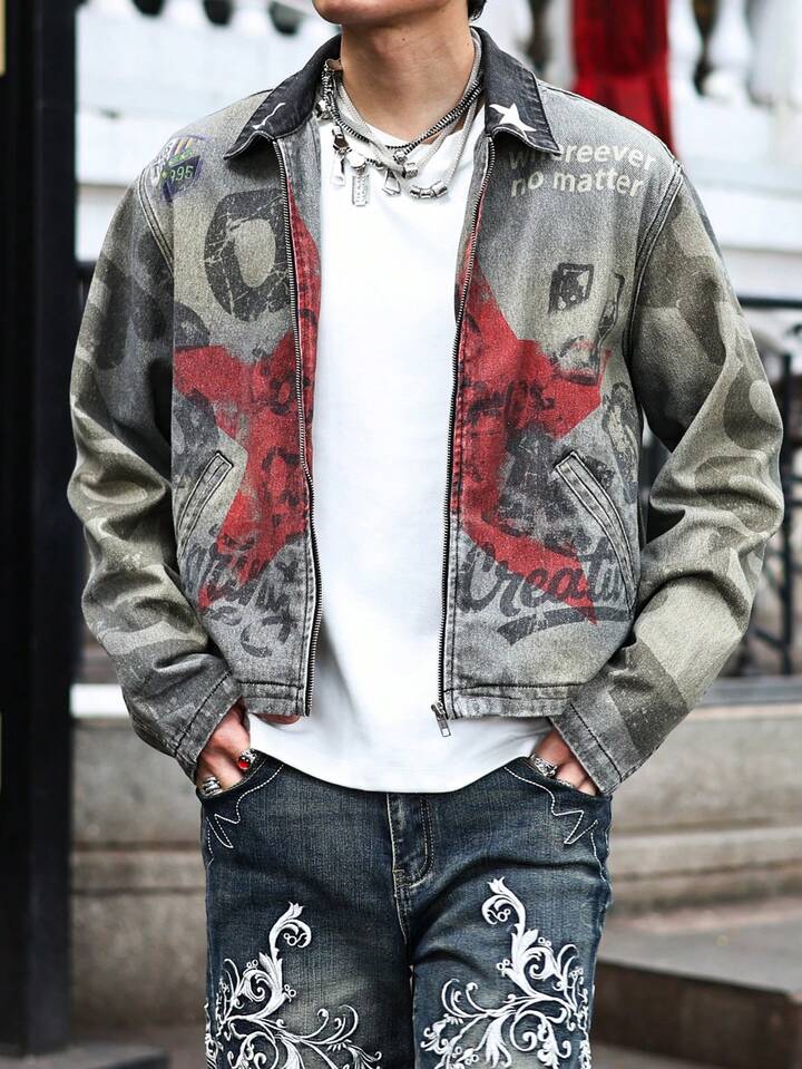 Street Life Veste en jean zippée délavée avec imprimé étoile et lettre, style mode de rue décontracté pour homme, printemps/automne
