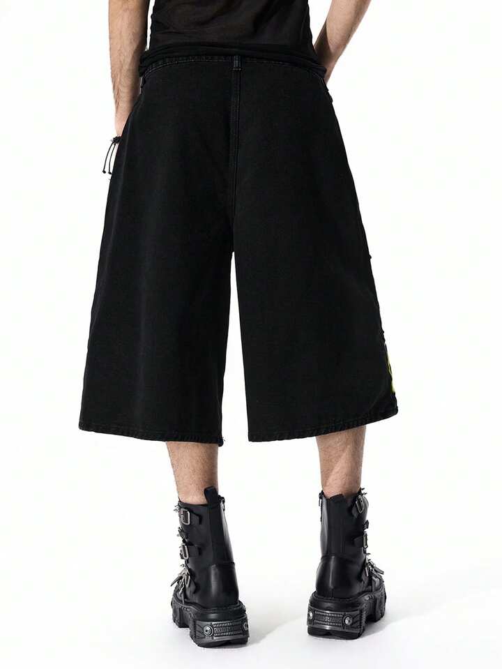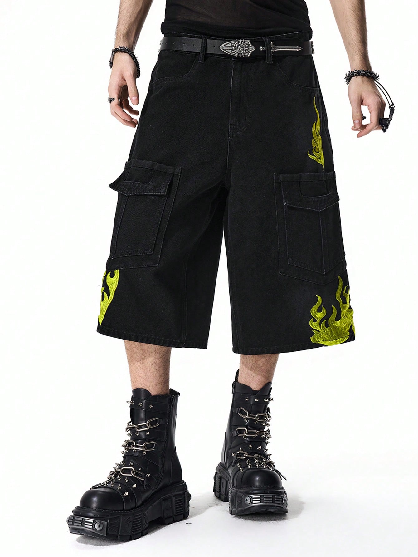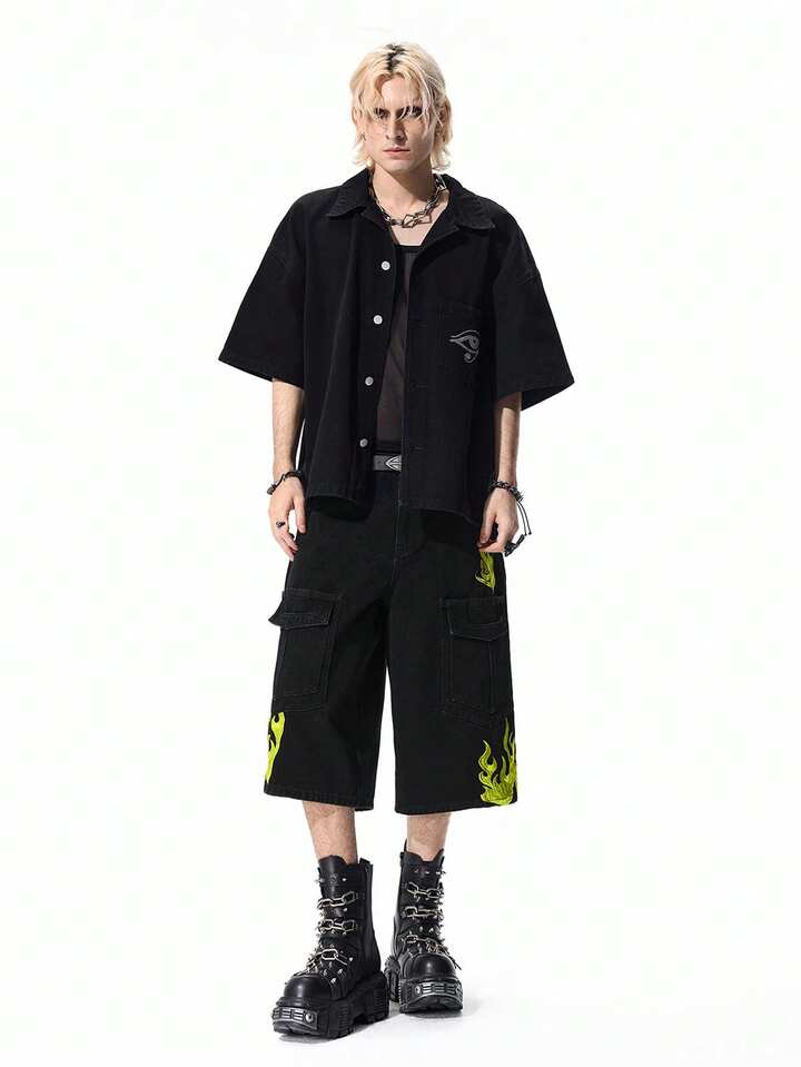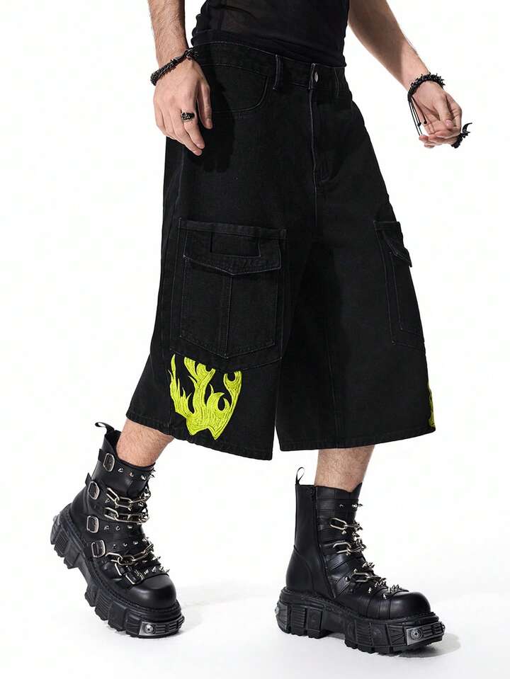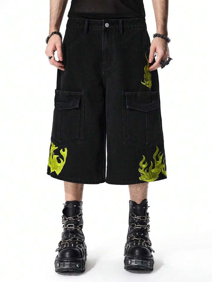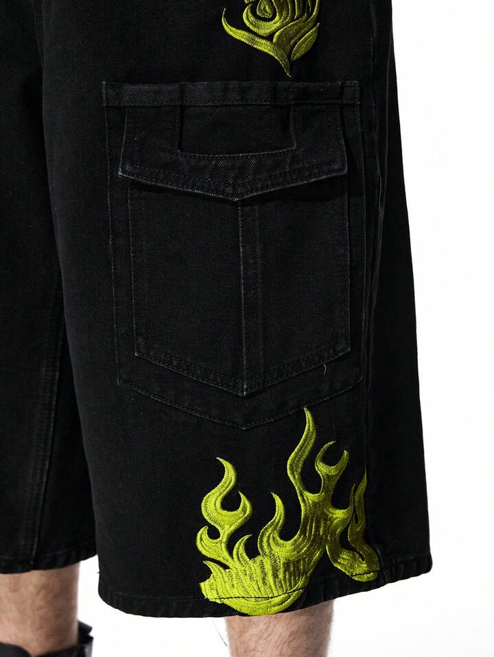 Street Life Shorts en jean cargo avec broderie de flamme pour hommes