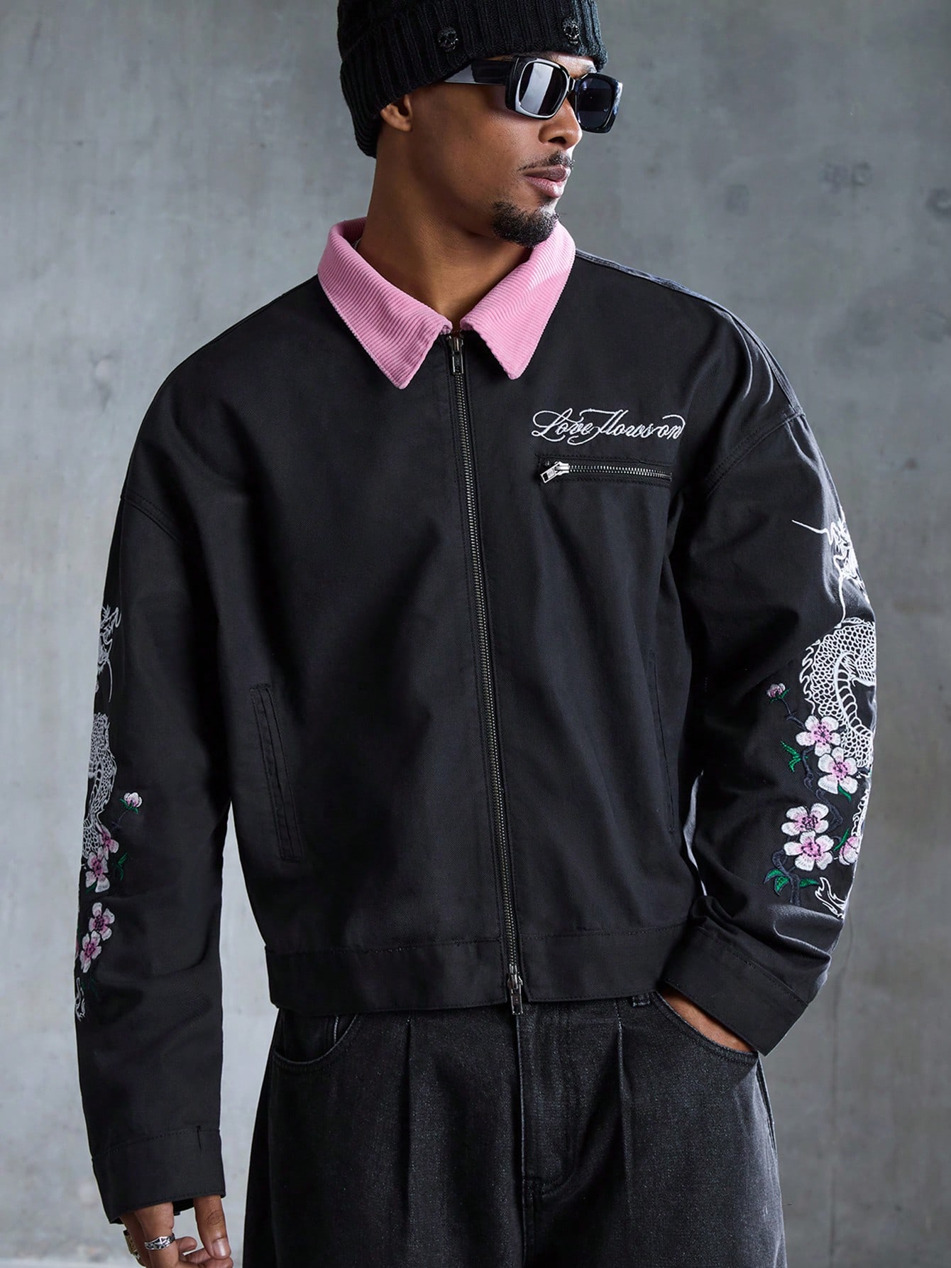 Street Life Veste en jean à manches longues avec col à revers, fermeture éclair et motif de broderie florale pour hommes