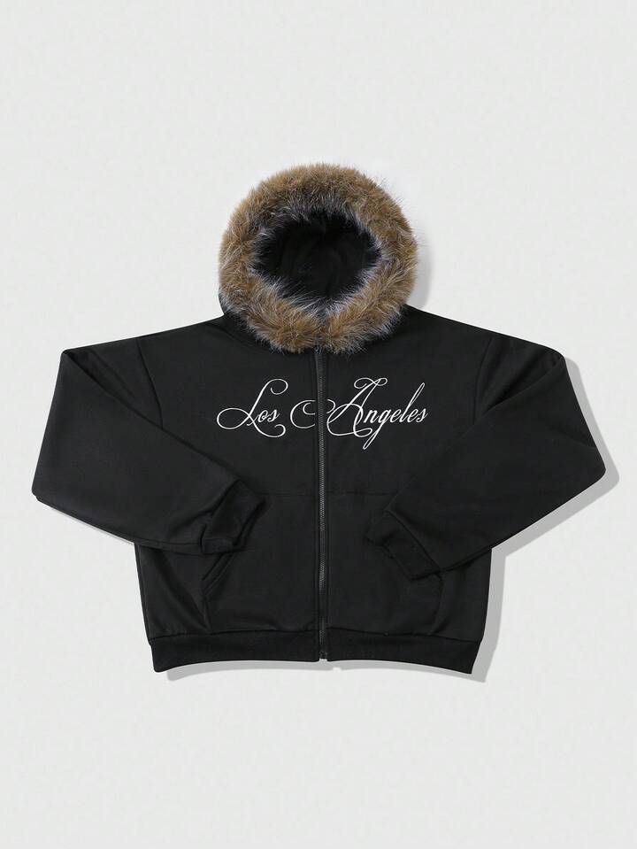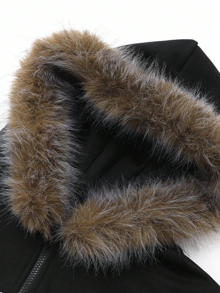 Street Life Sweat-shirt à capuche pour hommes avec texte anglais brodé et col en fourrure, style de rue, automne hiver