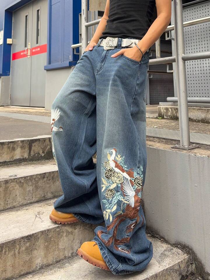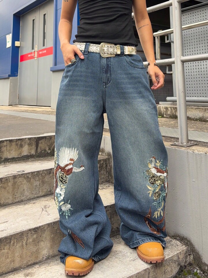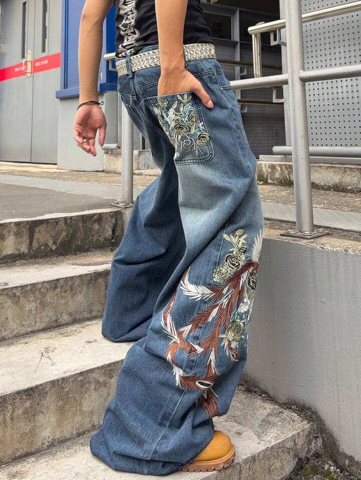 Street Life Jeans ample à jambe large avec motif de broderie florale pour hommes
