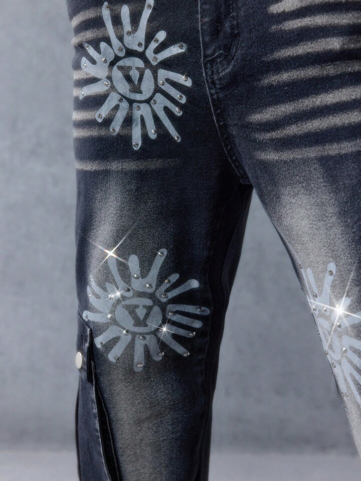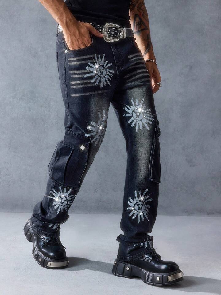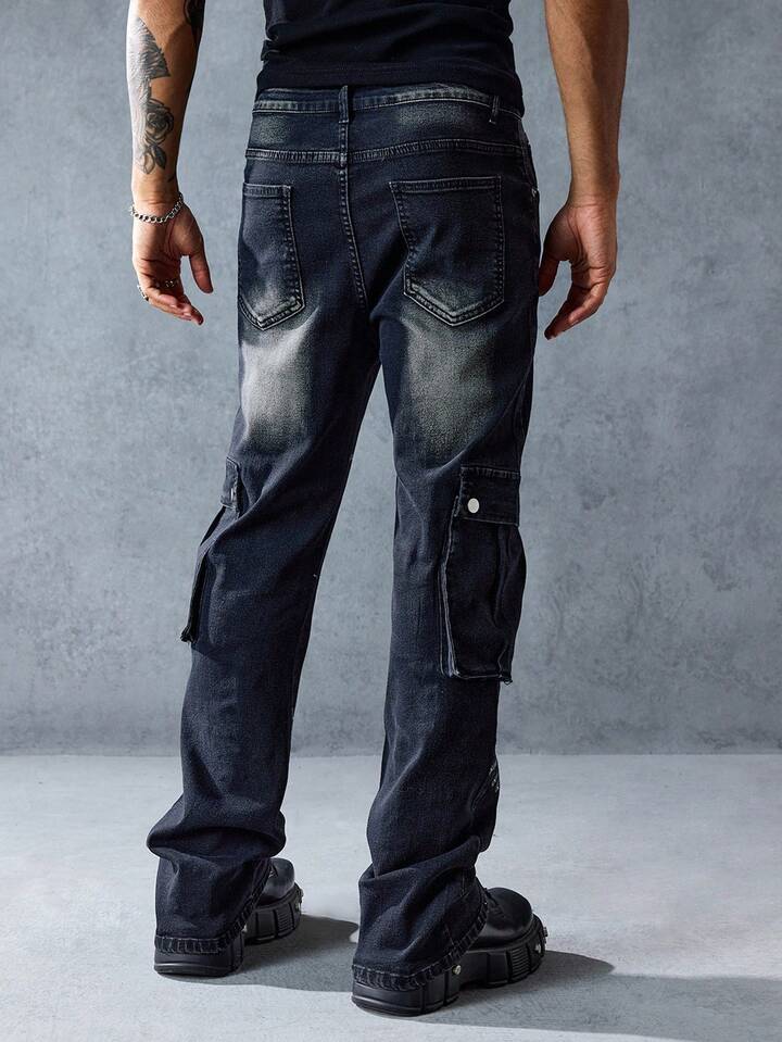 Street Life Jeans décontractés en denim avec poche cargo et graphique lettrage pour hommes