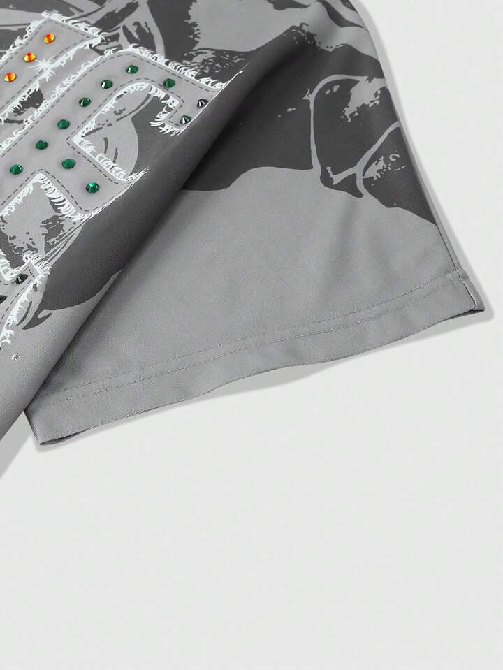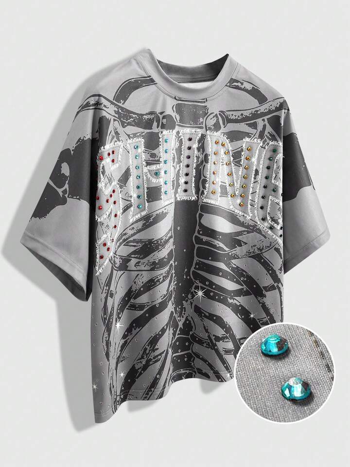 Street Life T-shirt casual à col rond à manches courtes avec imprimé lettres et squelette, strass. Idéal pour les raves et Halloween