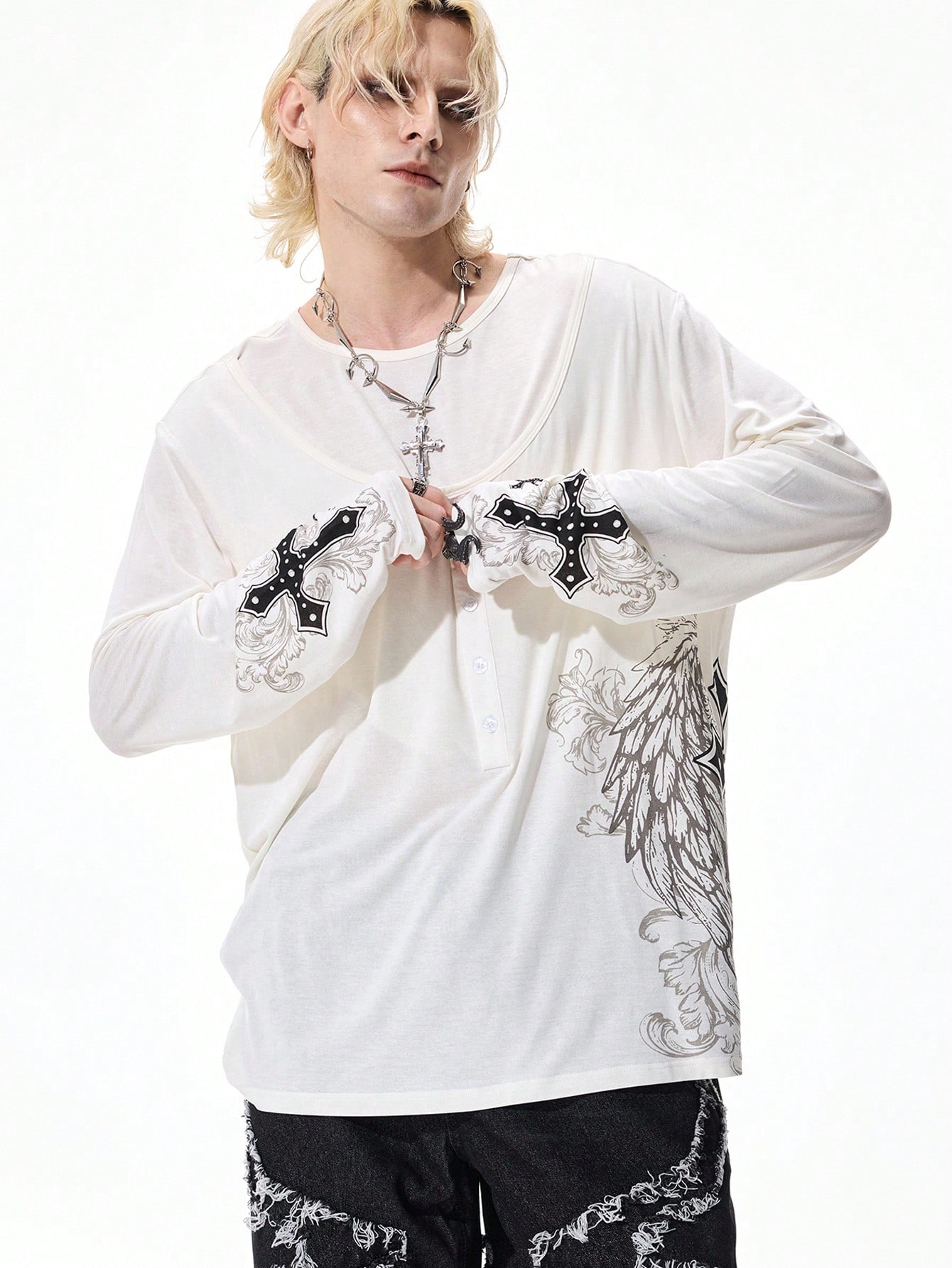 Street Life T-shirt à manches longues pour hommes avec imprimé aile et croix