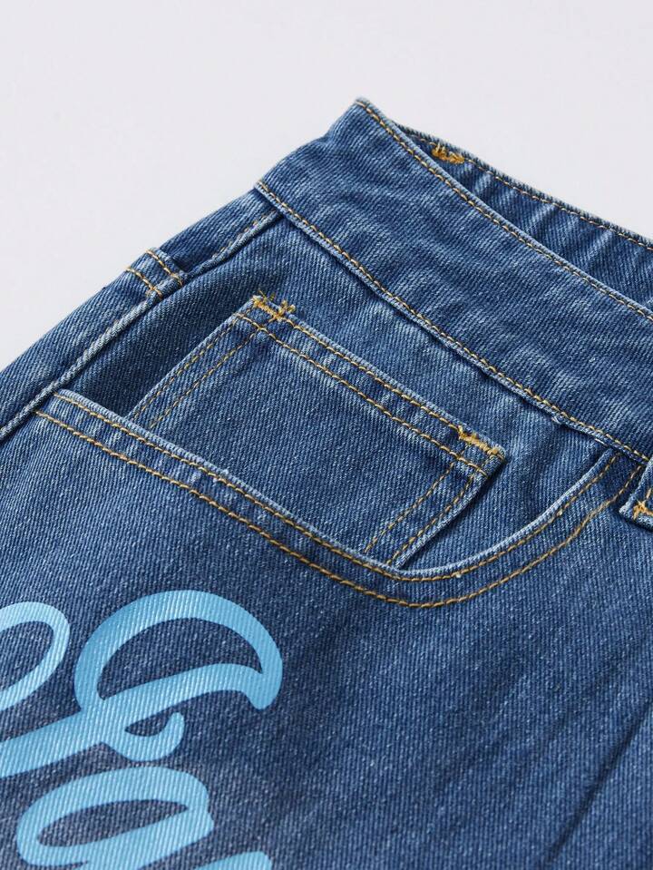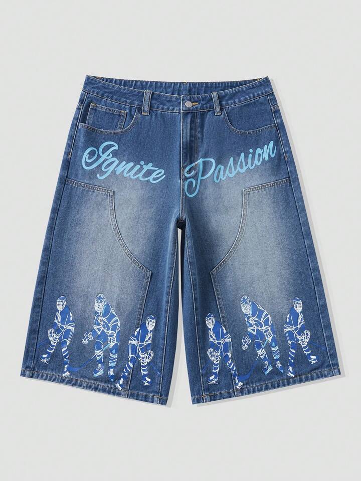 Street Life Short en denim de style décontracté et ample pour hommes avec imprimé de lettre et de chiffre, longueur sous le genou avec poche