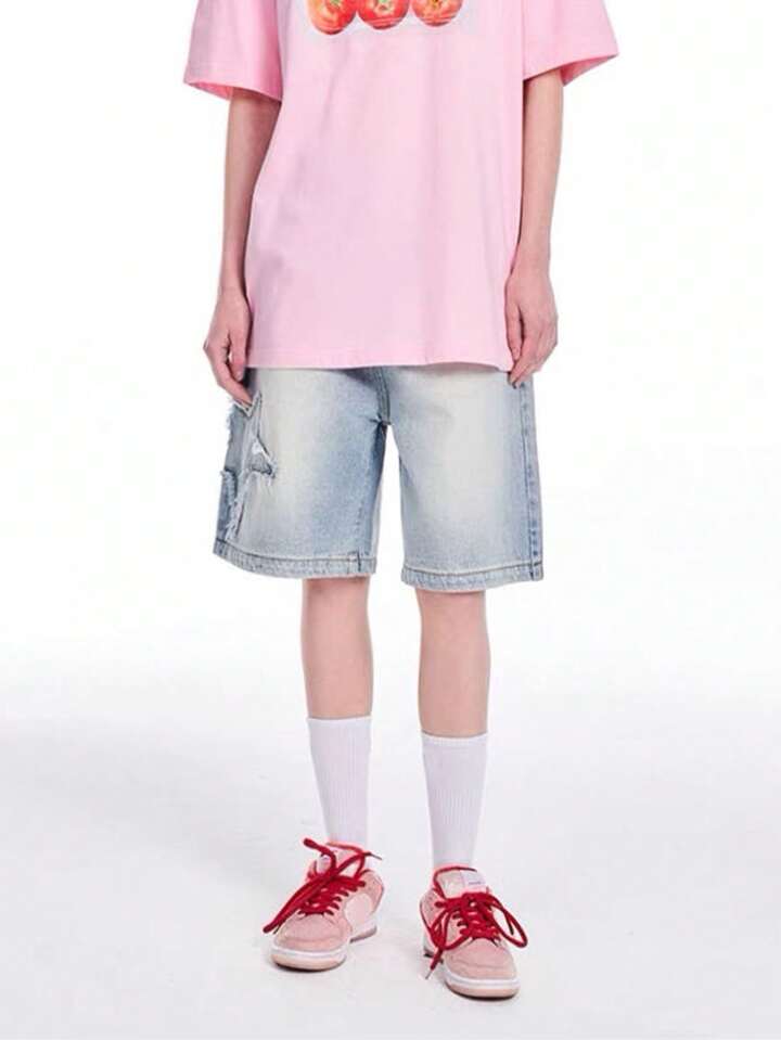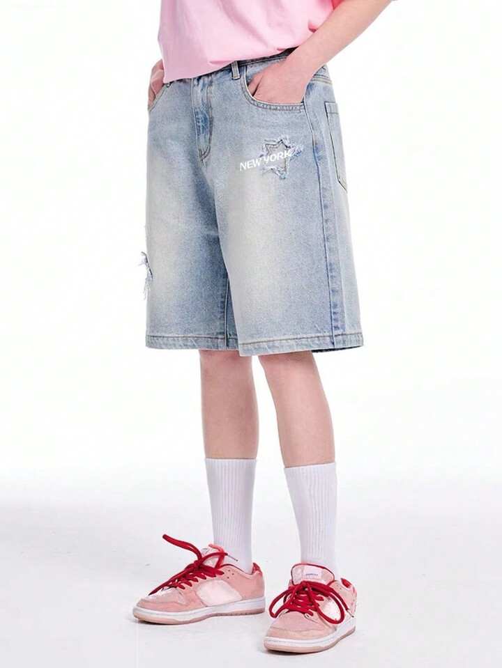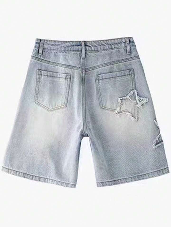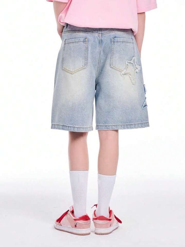 Street Life Short en jean ample pour hommes avec lettres, étoiles et patchs imprimés, convient pour le port quotidien, le printemps et l'été, l'école