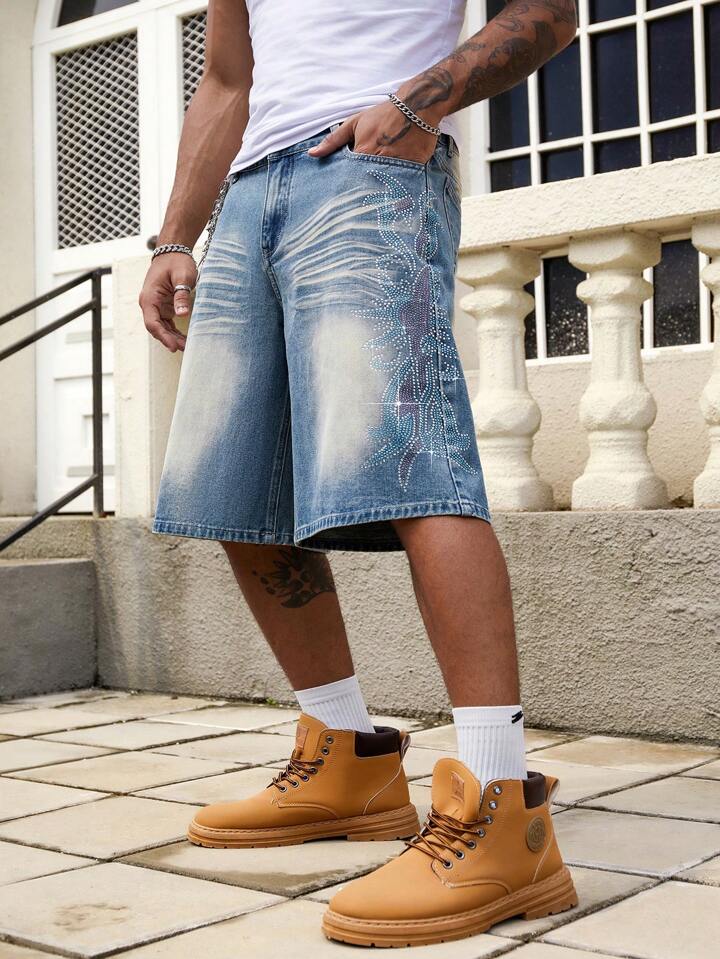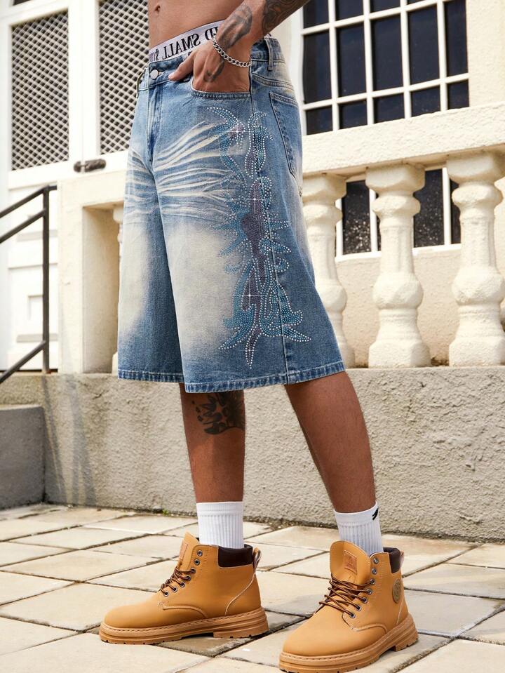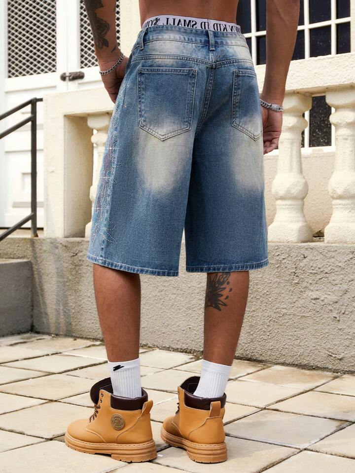 Street Life Short en jean ample pour homme avec poches cloutées de strass