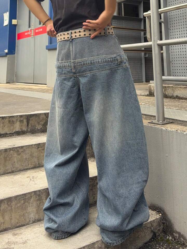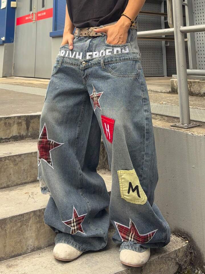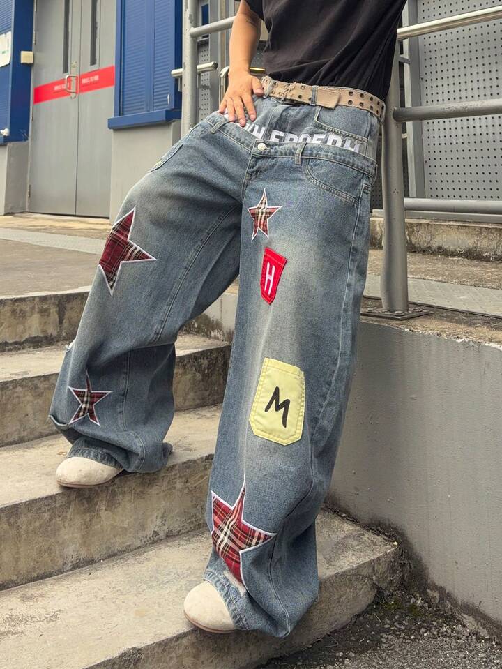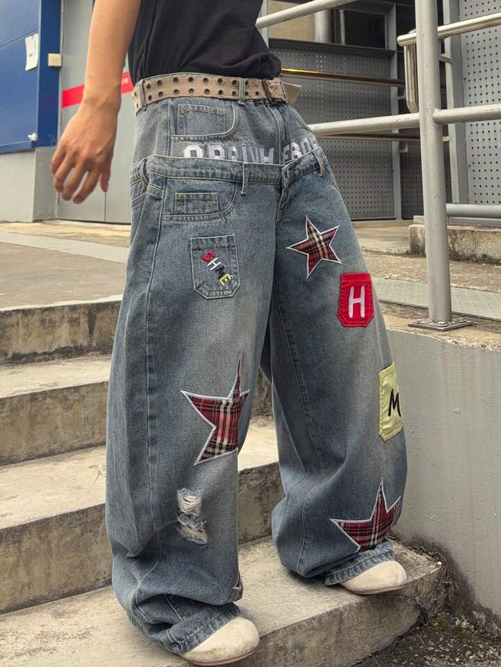 Street Life Jeans évasés à taille double avec broderie d'étoiles, coupe ample pour hommes