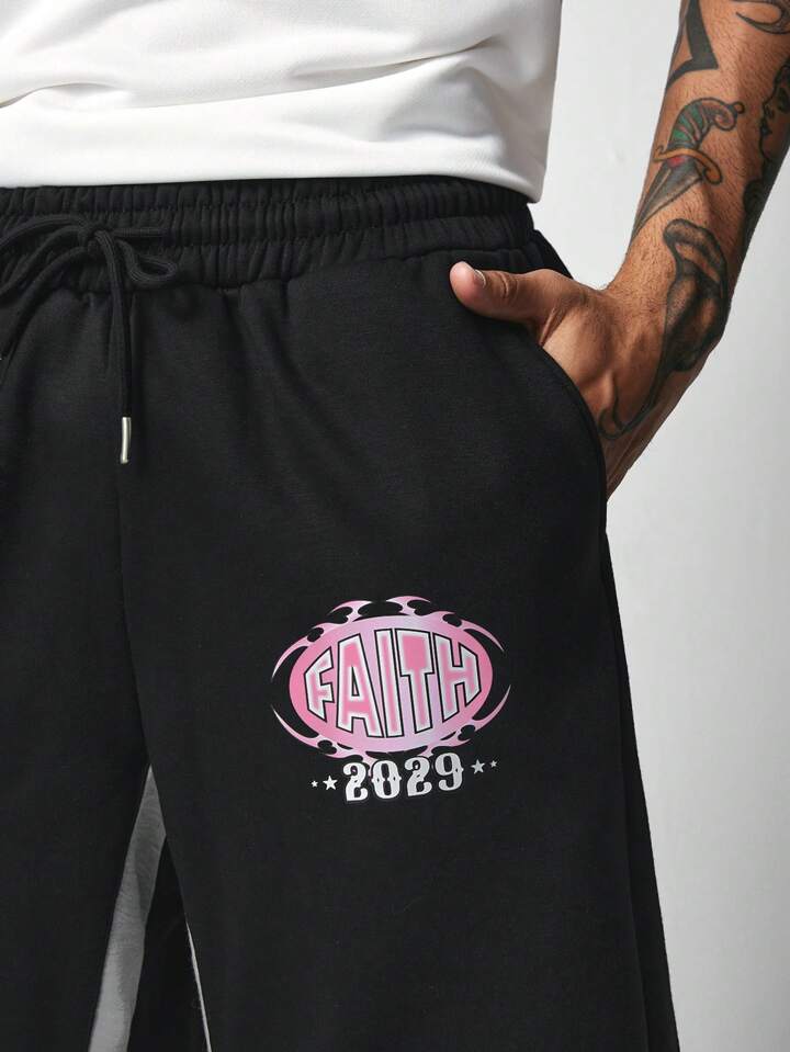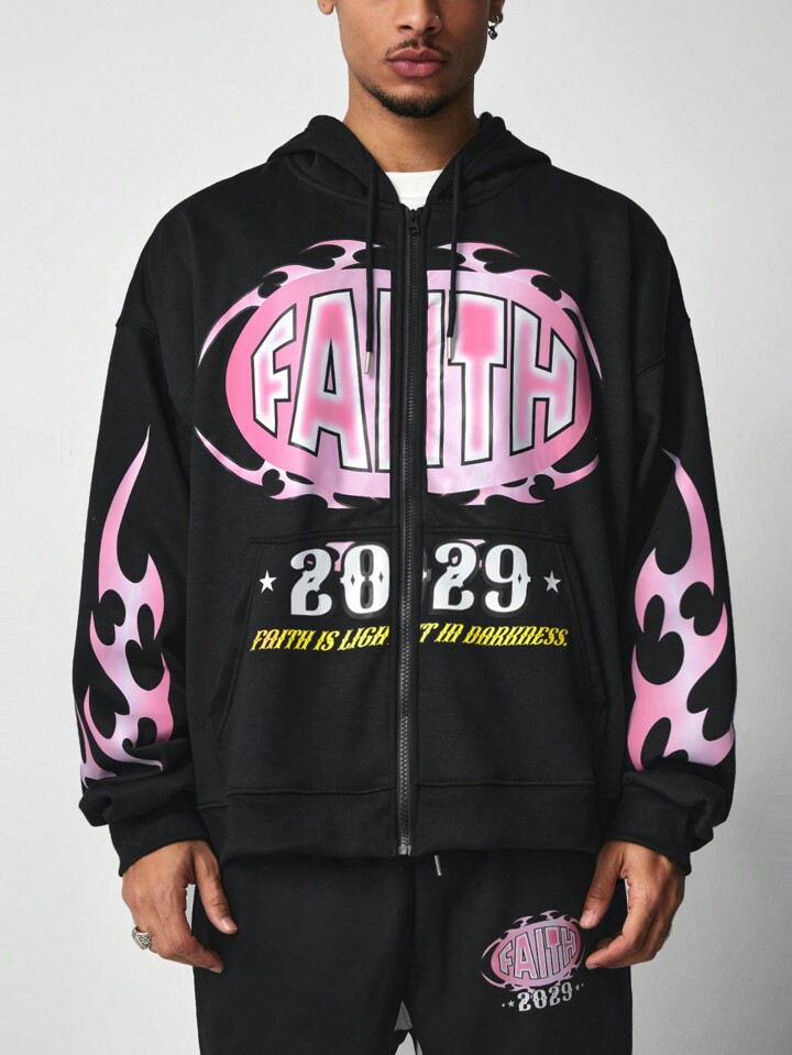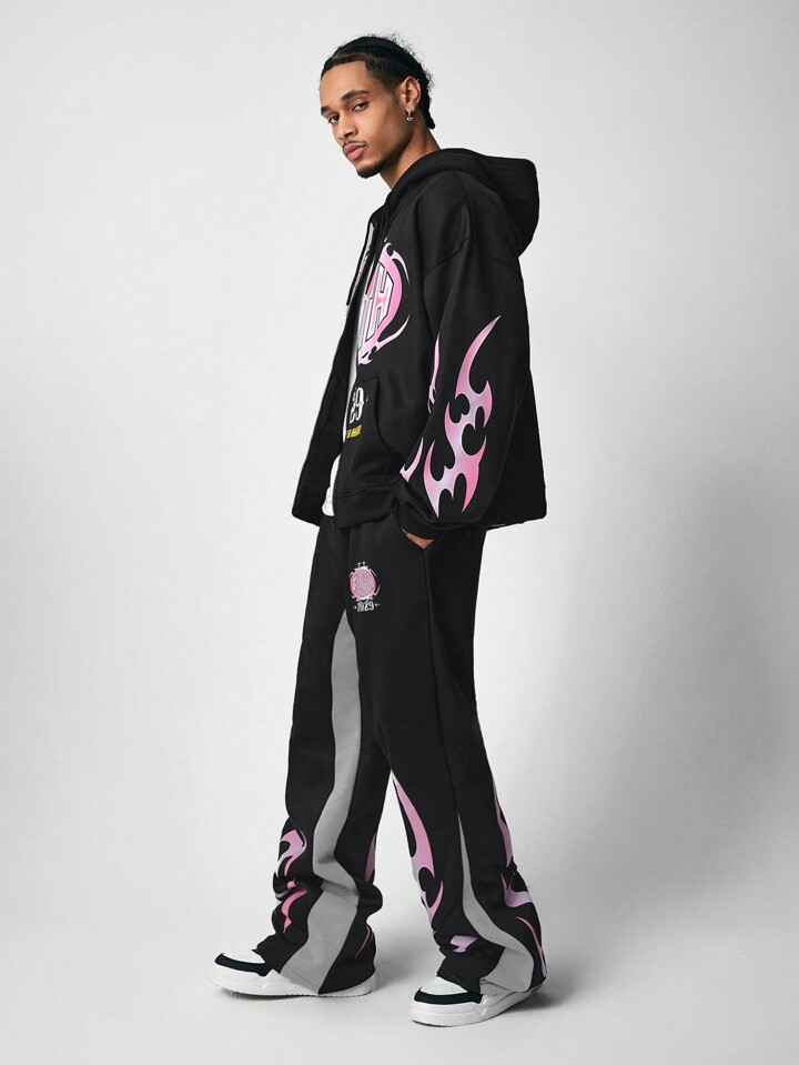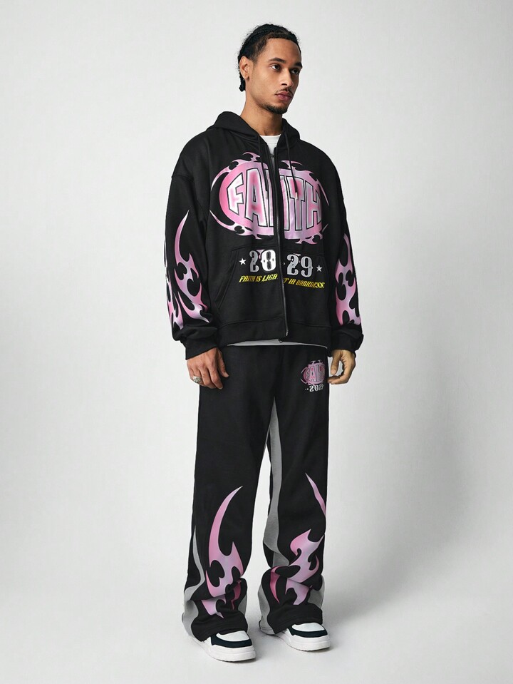 Street Life Ensemble de jogging homme comprenant un sweat-shirt à capuche zippé ample avec imprimé lettres et un pantalon de survêtement évasé. Style streetwear