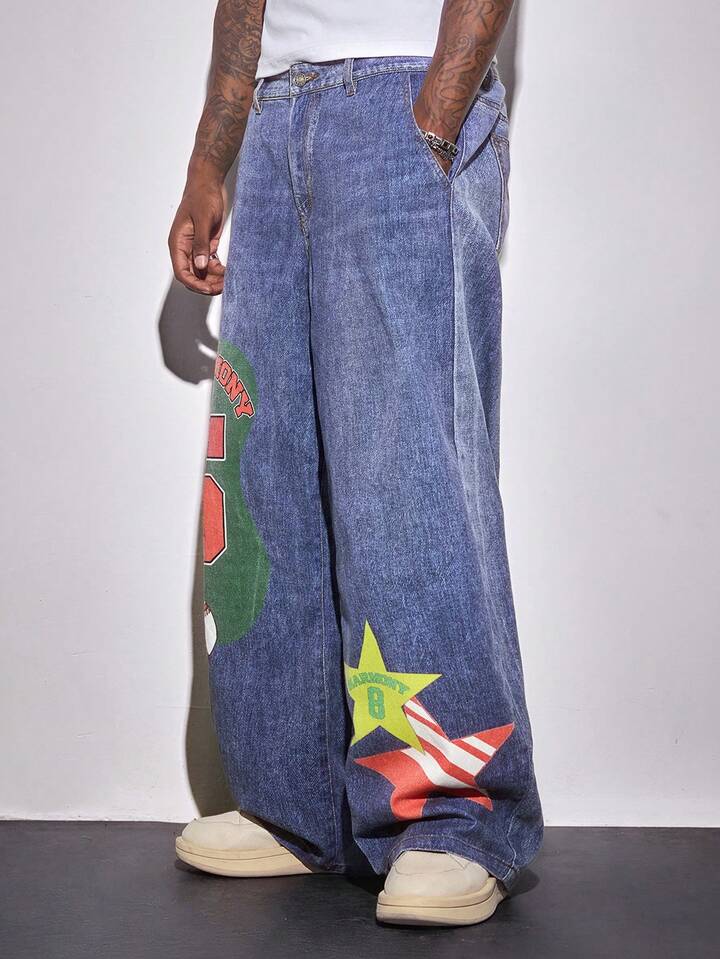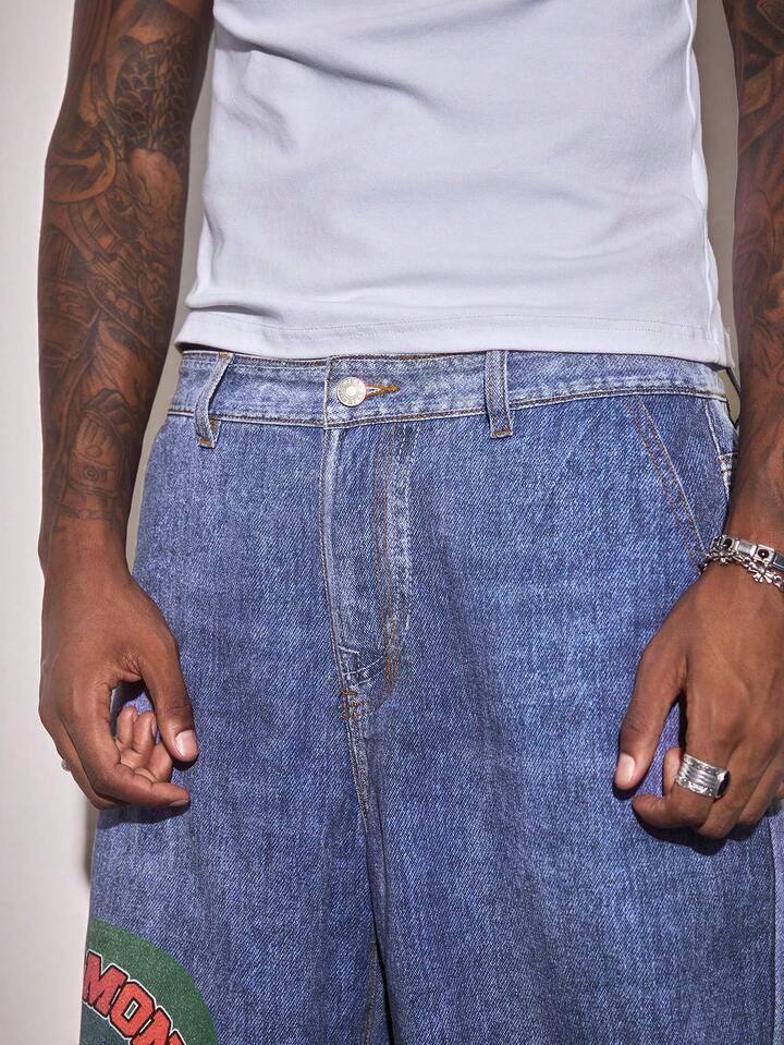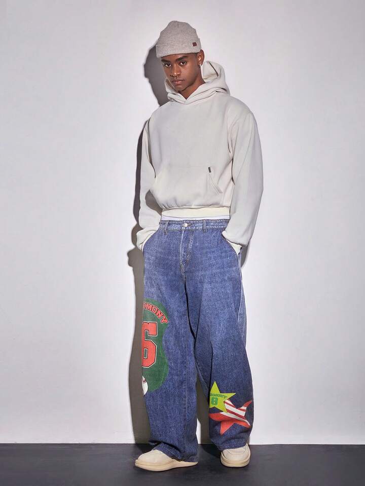 Street Life Jeans évasés à jambe large, ample et décontracté avec imprimé numérique sur la poche pour hommes