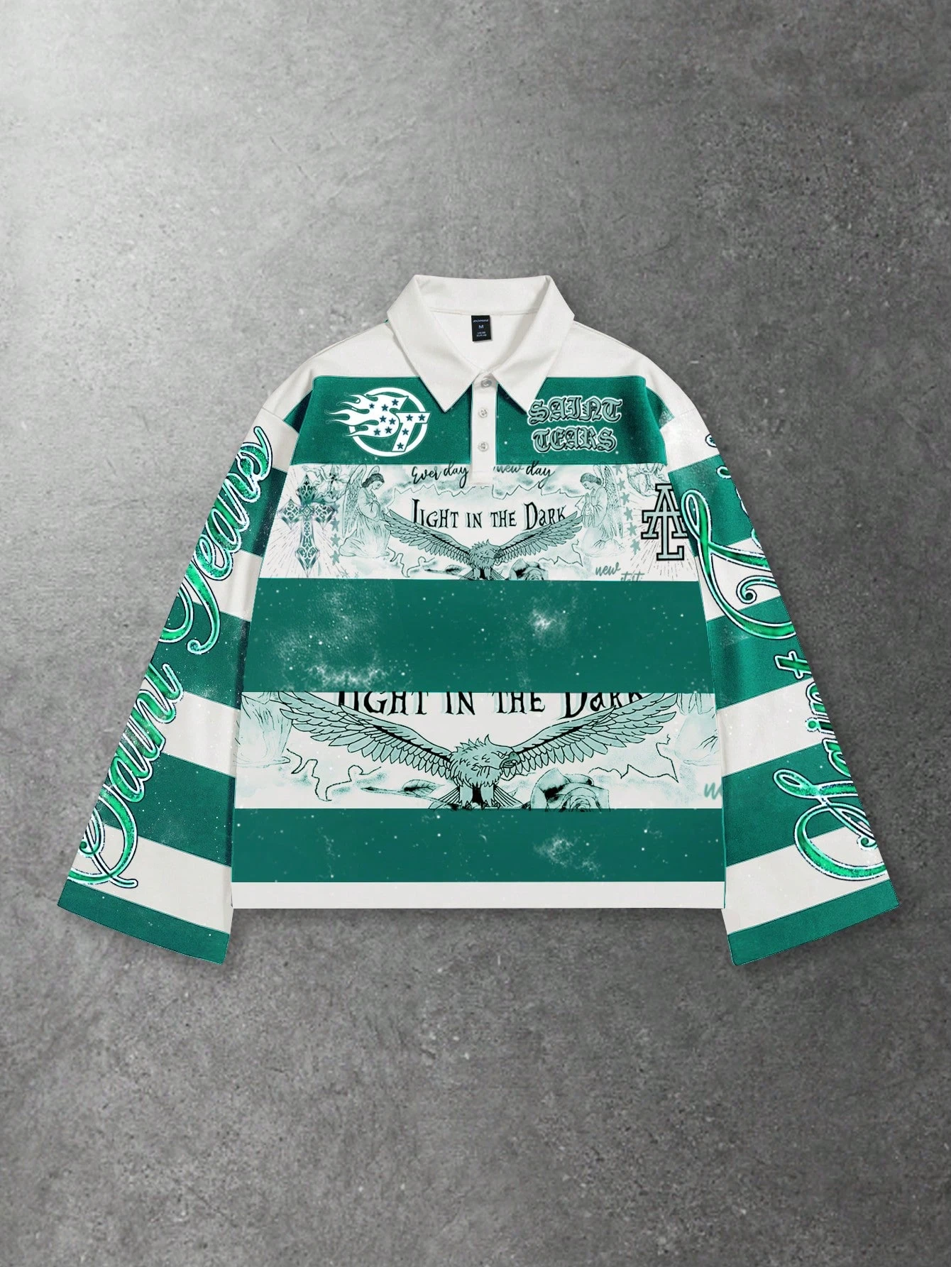 Street Life Polo à manches longues imprimé rayé pour hommes, style décontracté de type universitaire