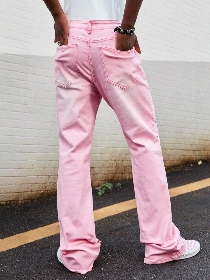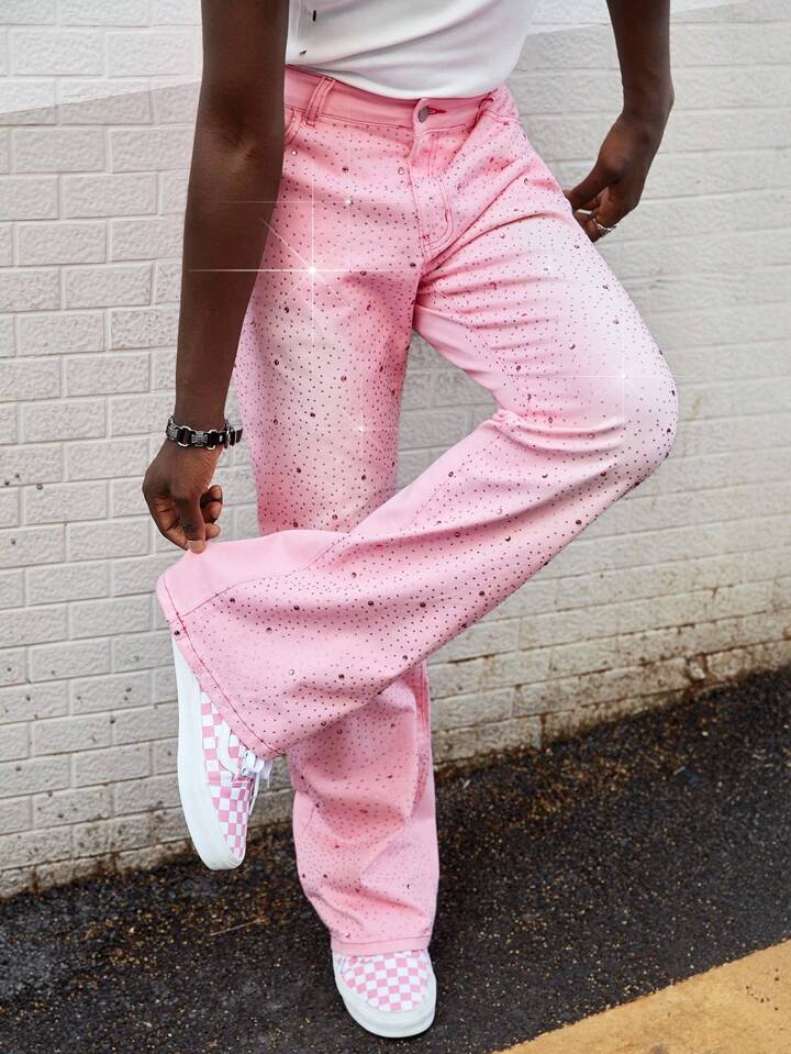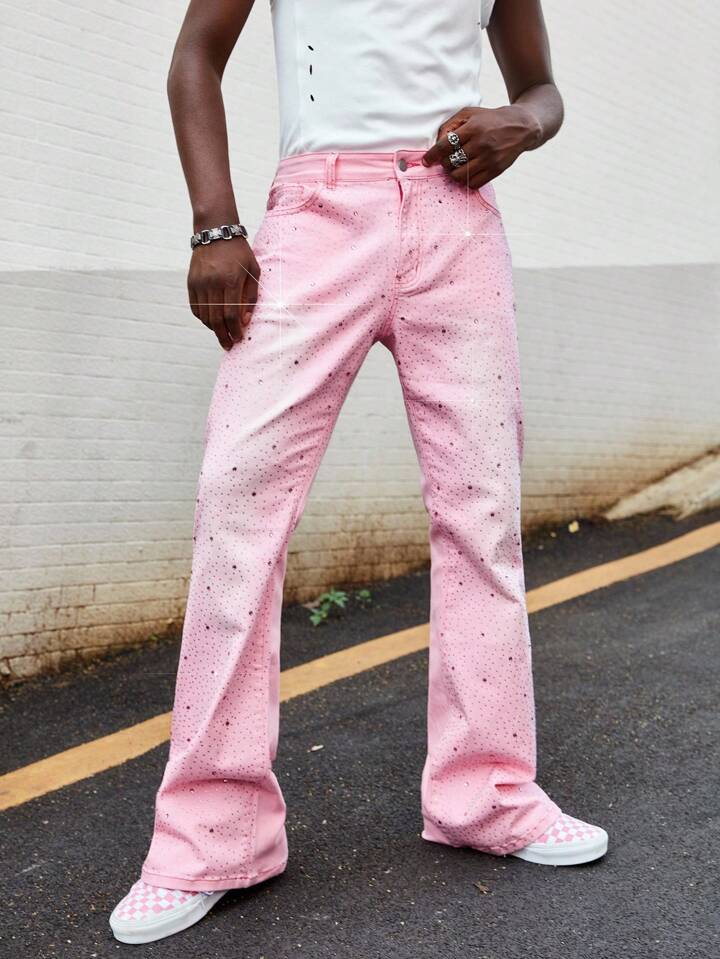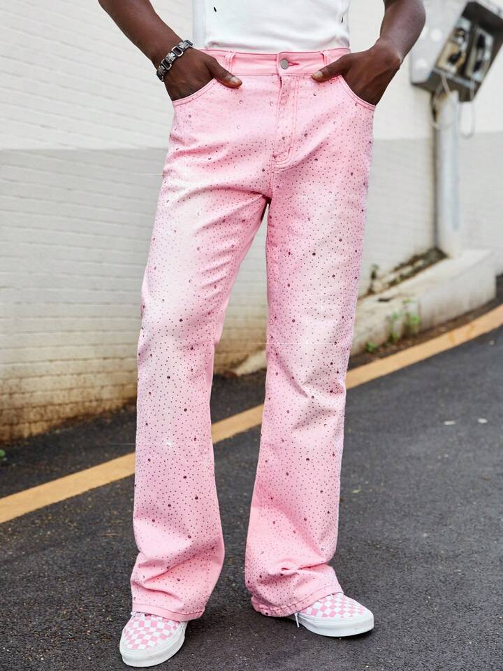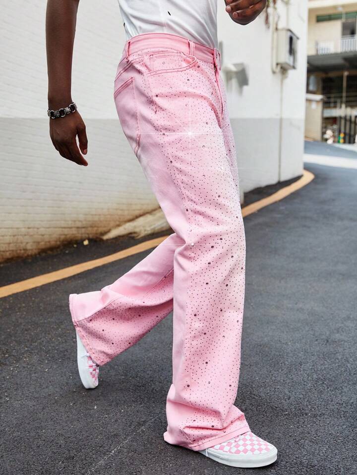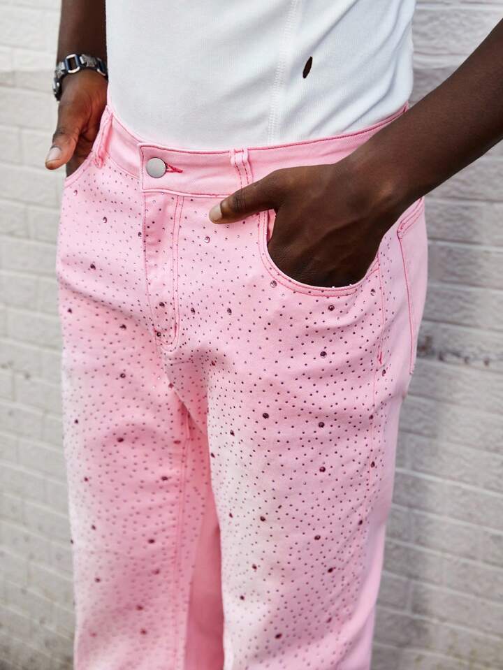 Street Life Jeans décontractés roses ornés de strass pour hommes