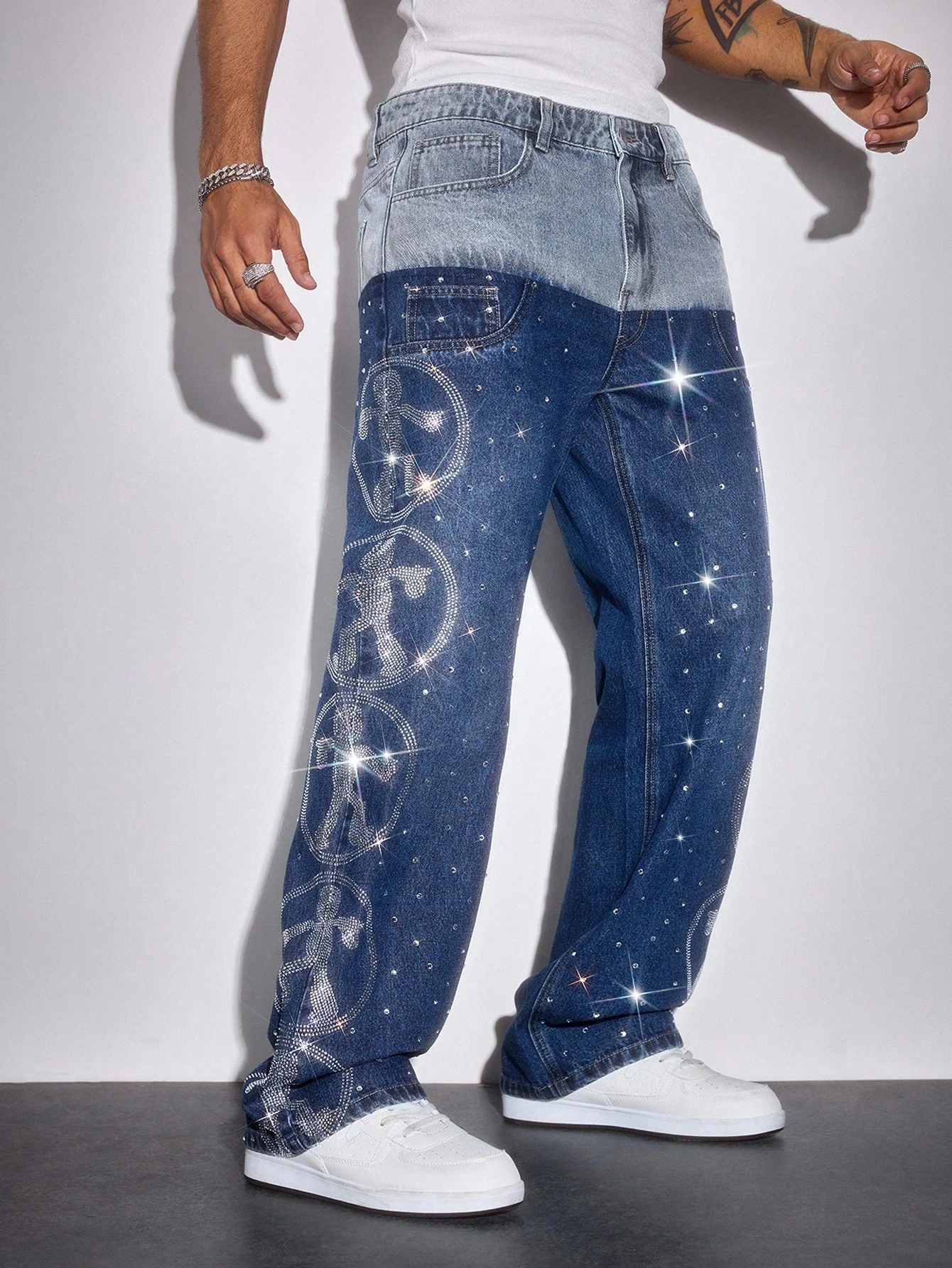 Street Life Jeans en denim à patchwork de strass et couleur contrastée pour hommes