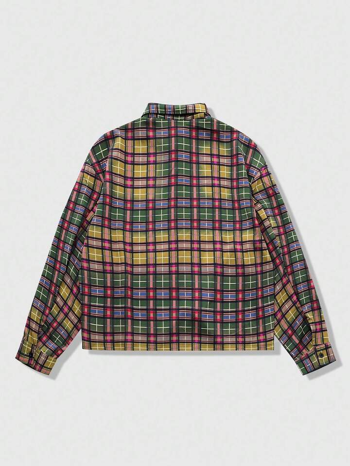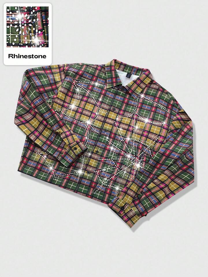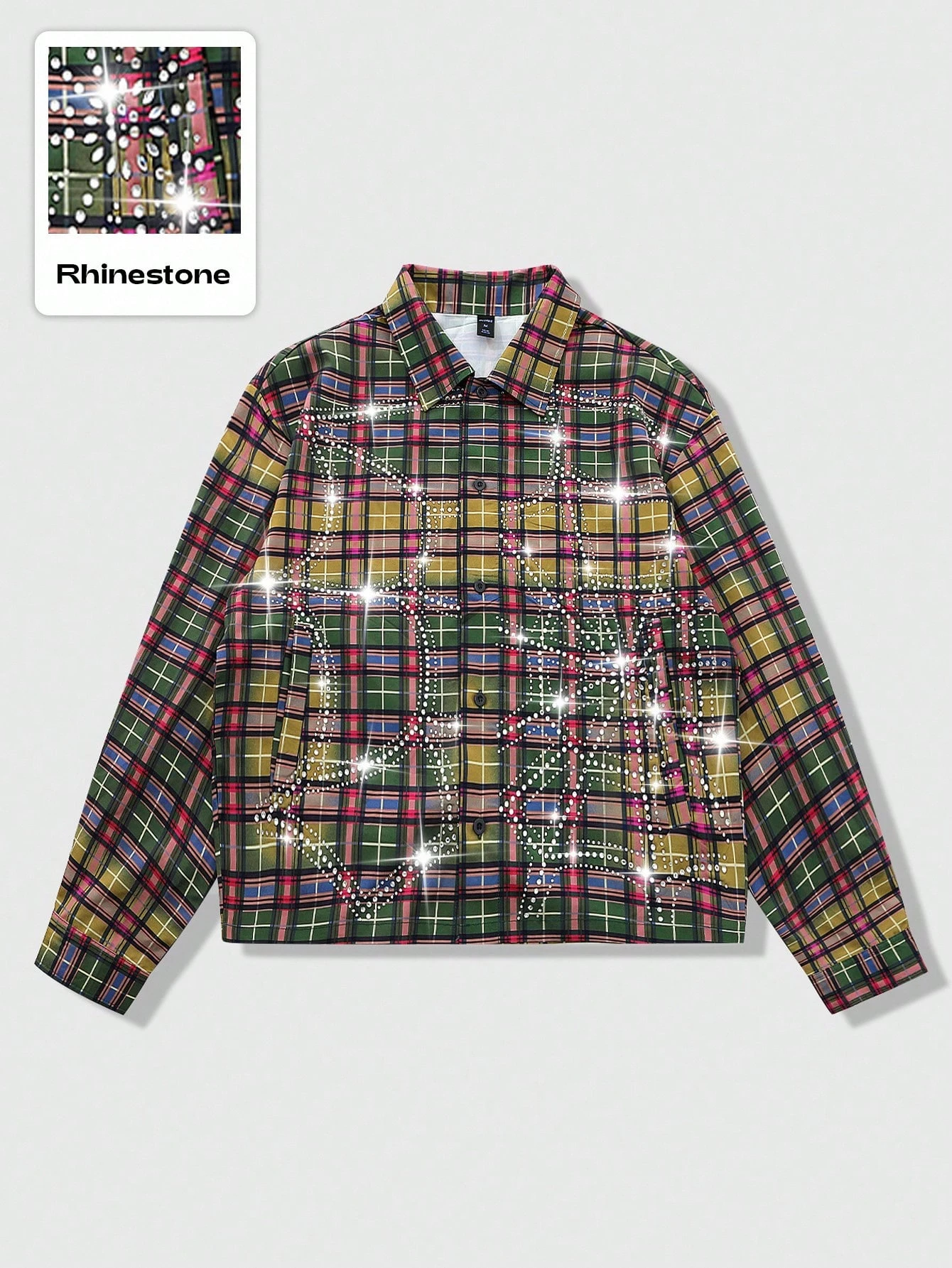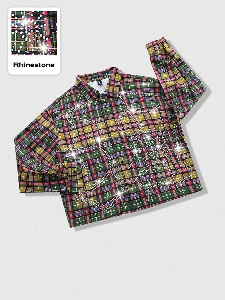 Street Life Chemise pour hommes avec motif à carreaux strass, manches longues, style américain streetwear