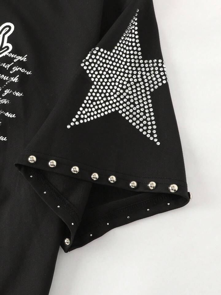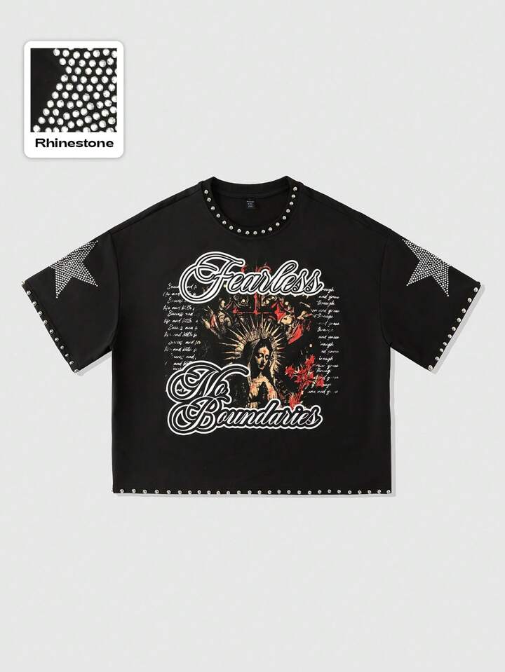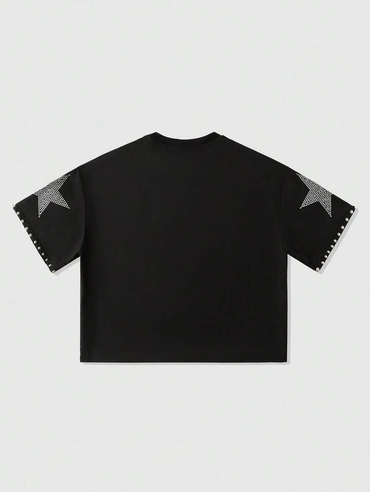 Street Life T-shirt à manches courtes pour hommes avec imprimé de rivets scintillants et diamants, style ample et court, style années 2000