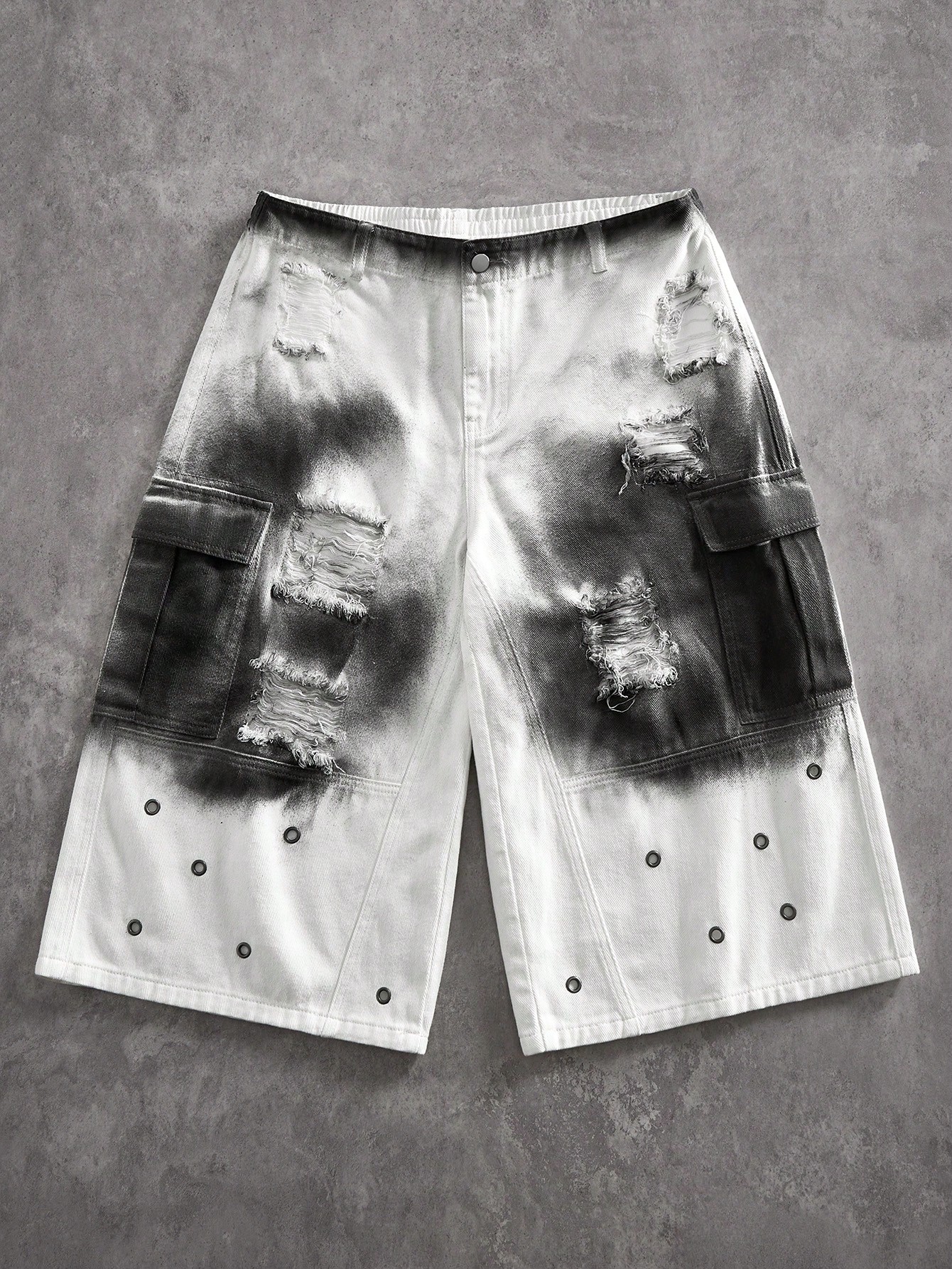 Street Life Jeans cargo larges et amples pour hommes, style décontracté d'été, effet dégradé, délavé et déchiré, avec œillets, sans ceinture à chaîne