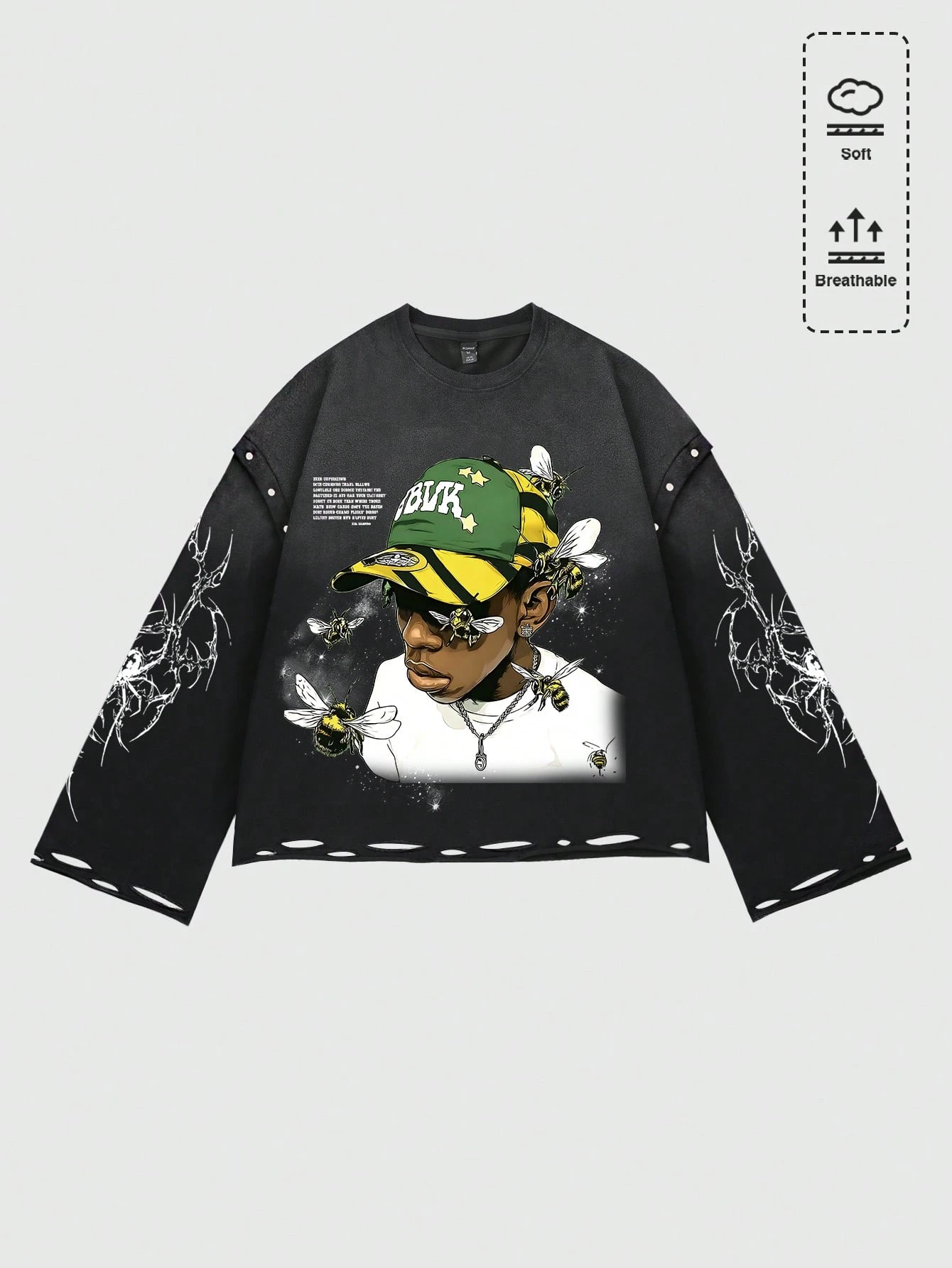 Street Life T-shirt à manches longues vintage délavé et déchiré pour hommes, coupe ample