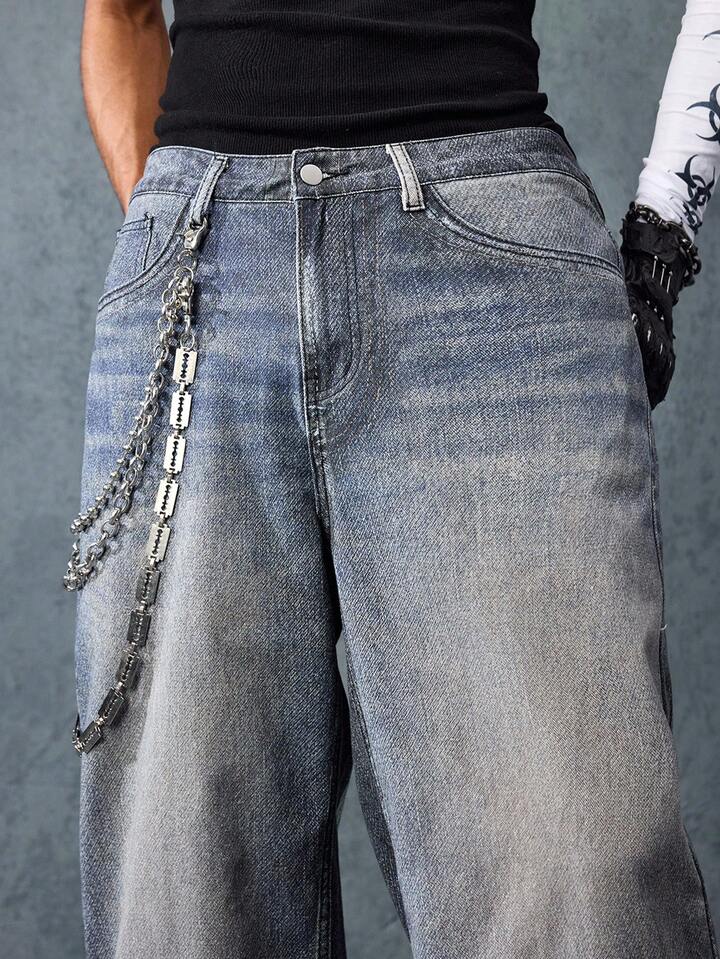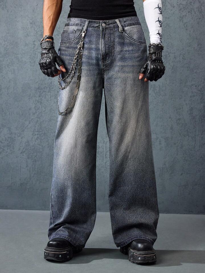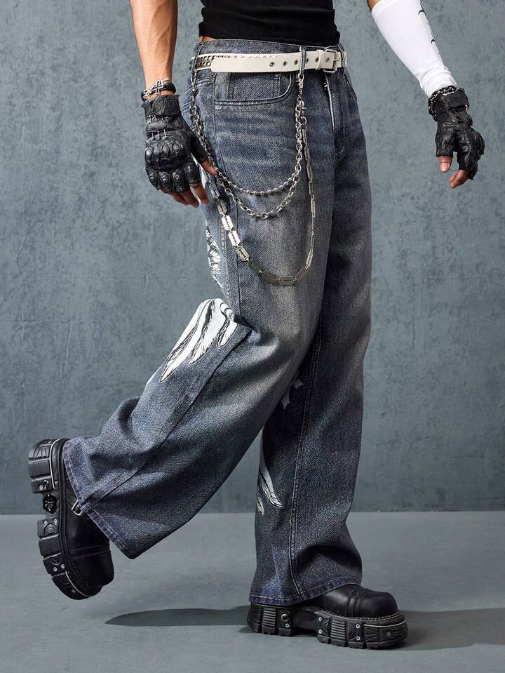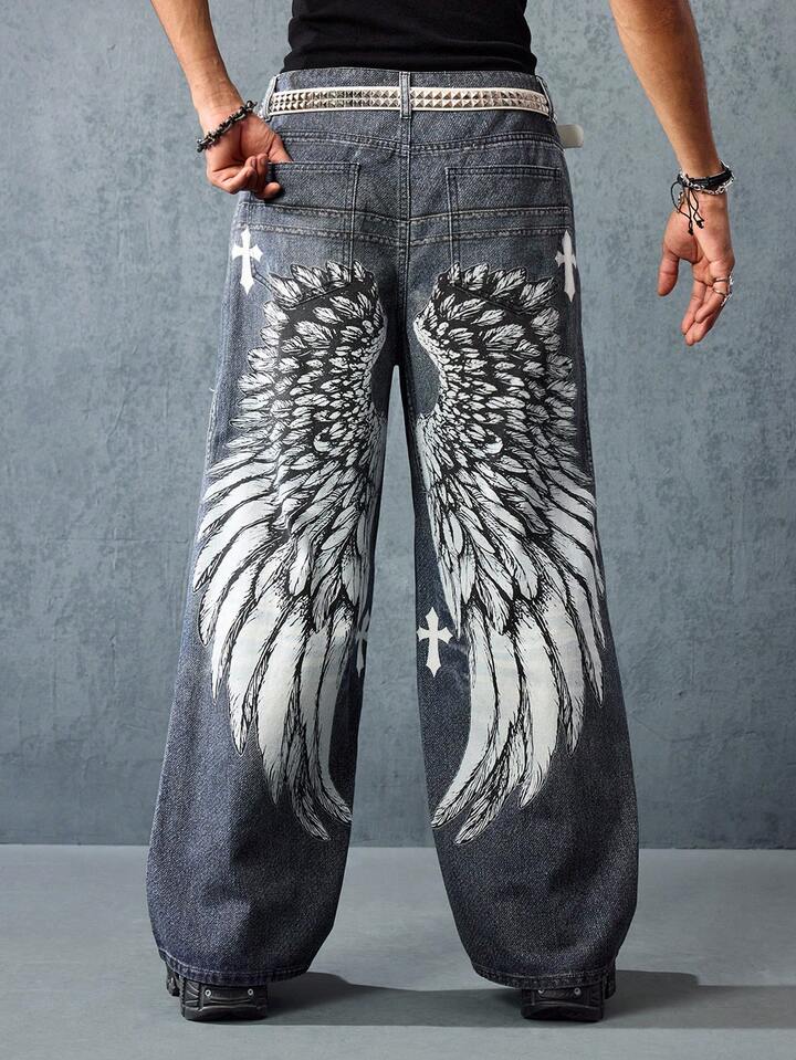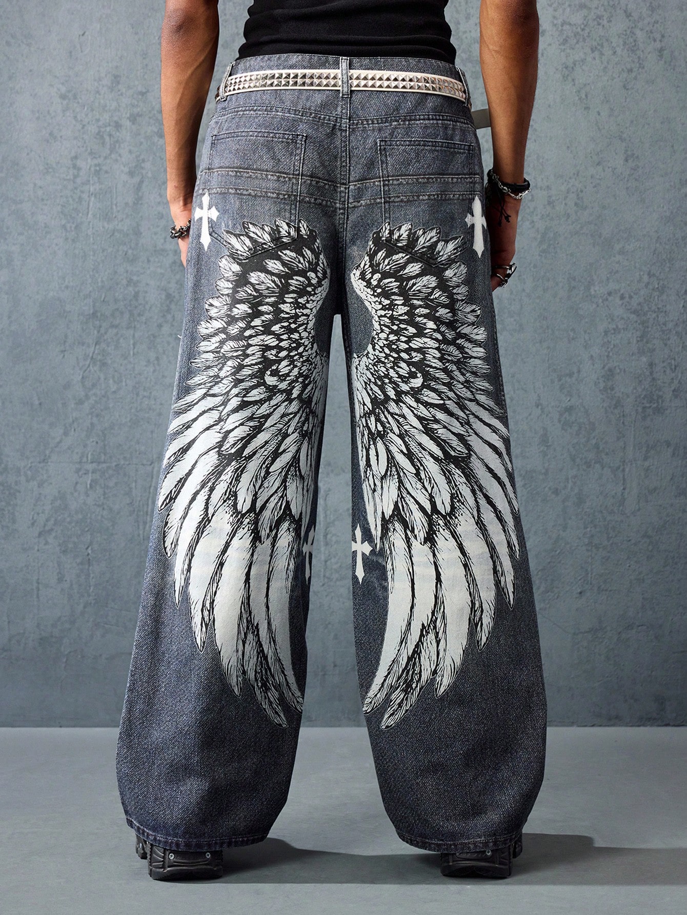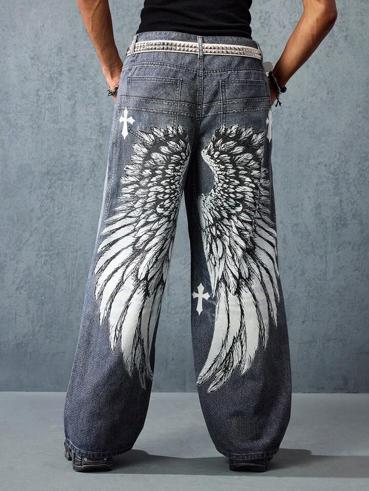 Street Life Jeans amples et décontractés à jambe large avec graphique d'aile, mode de rue pour hommes