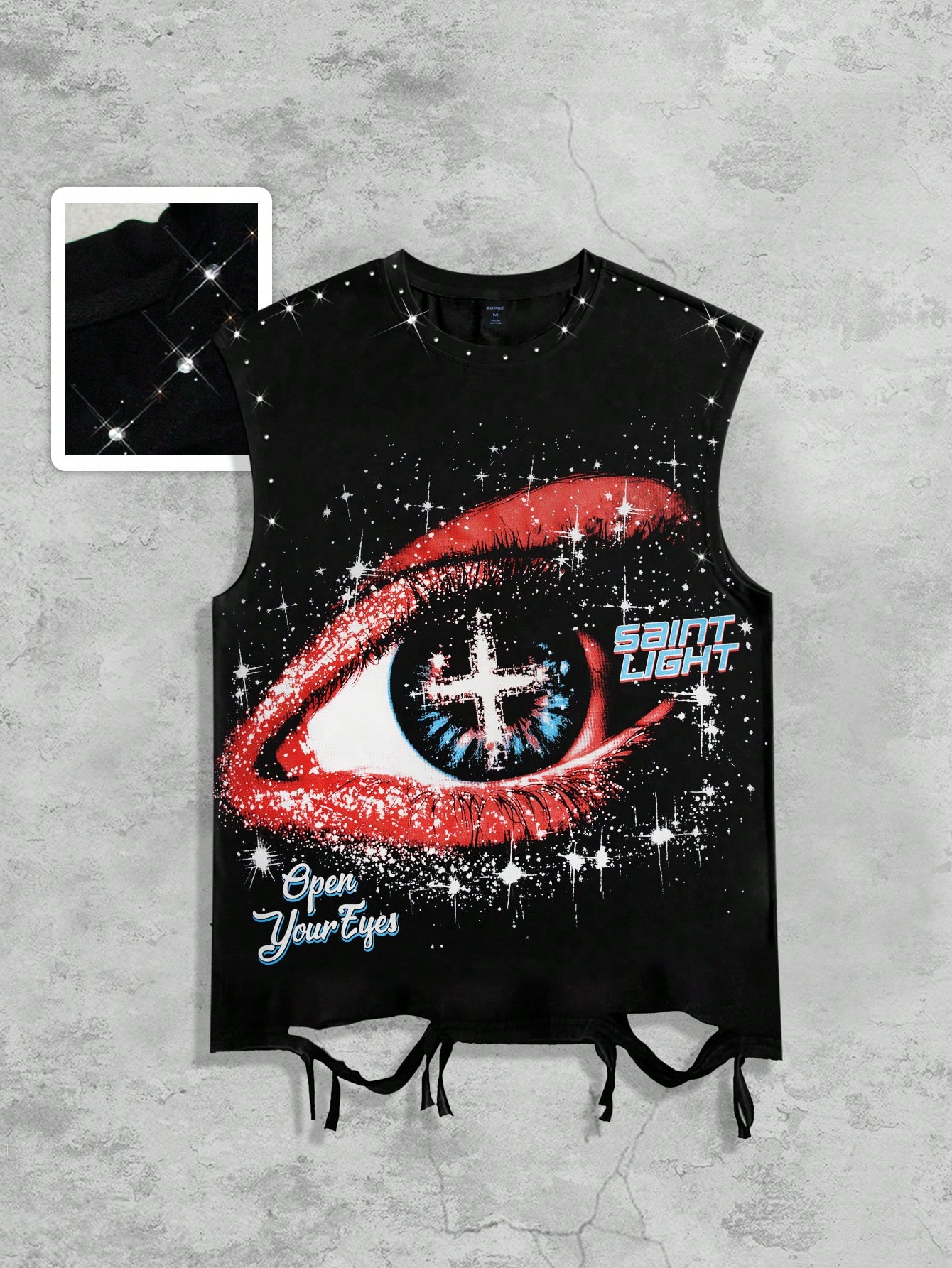 Street Life Débardeur à col rond style punk de rue avec imprimé graphique, strass et détails déchirés, pour hommes en été