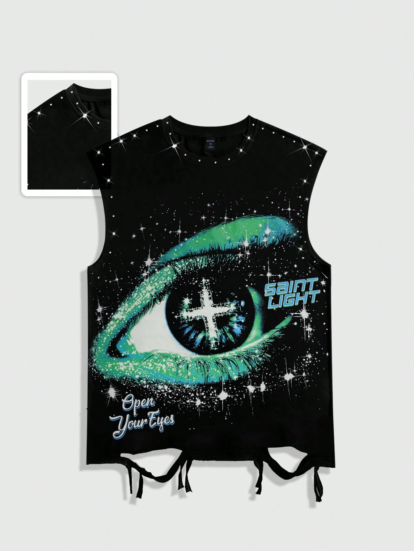 Street Life Débardeur à col rond style punk avec imprimé graphique de rue, strass et détails déchirés, pour hommes en été