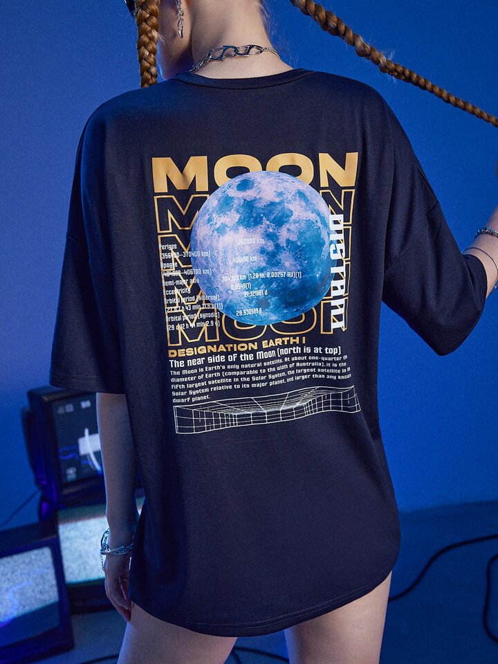 Street Life T-shirt surdimensionné avec graphique de la planète et slogan "DÉSIGNATION DE LA LUNE TERRE Le côté rapproché de la Lune, le nord est en Top, école
