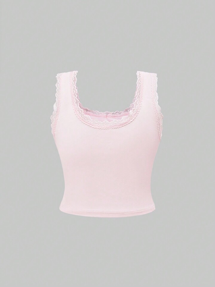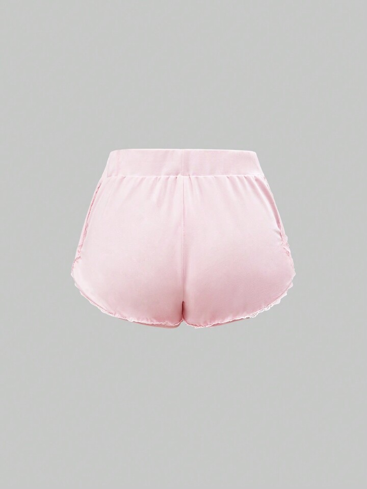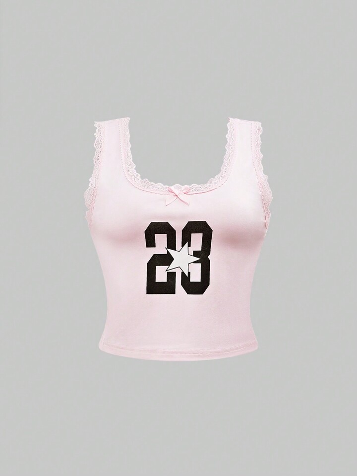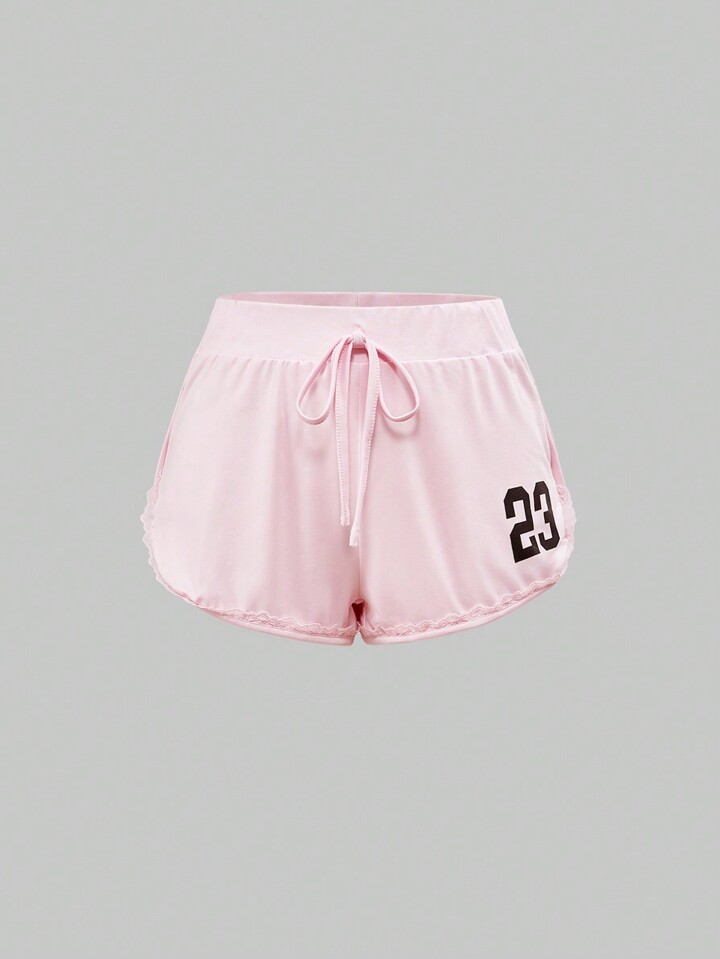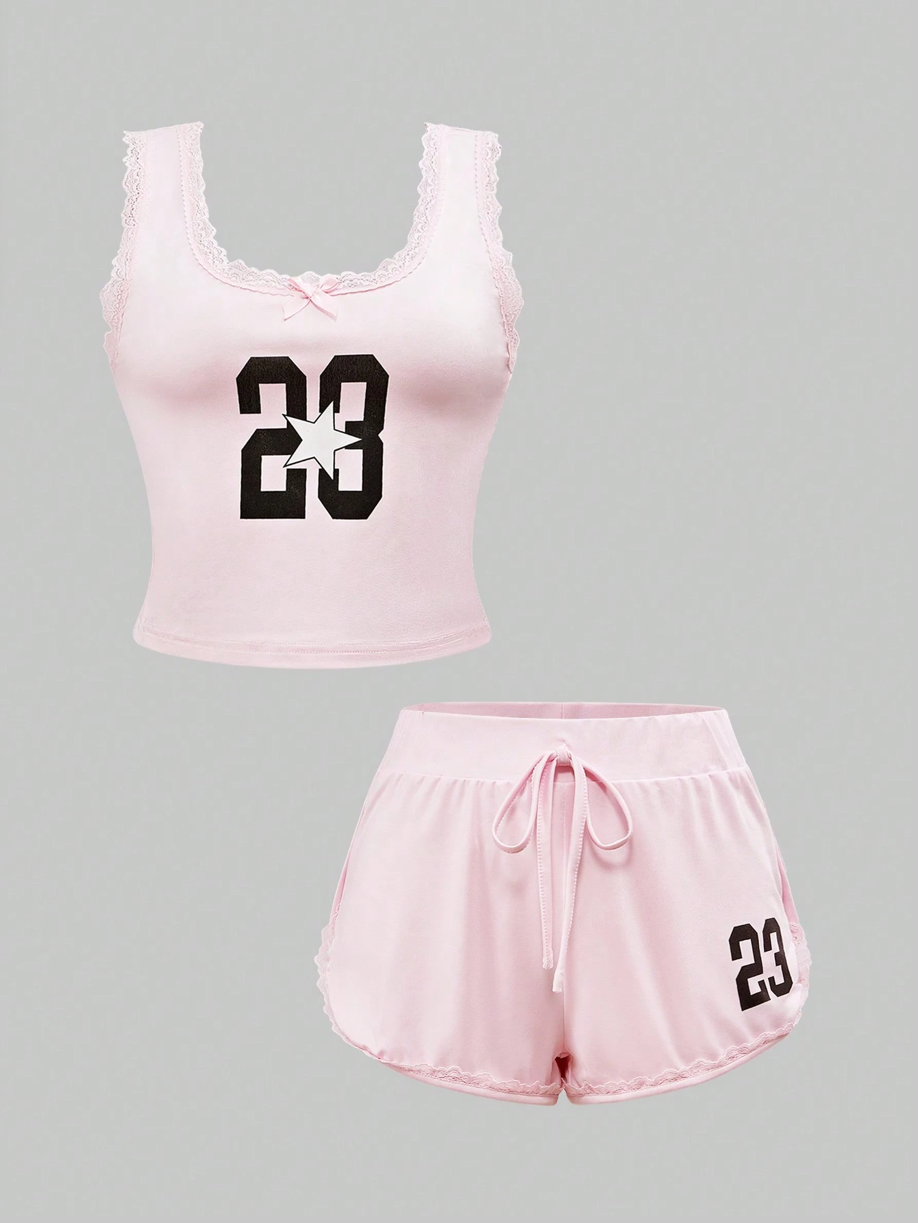 Street Life Ensemble de pyjama d'été casual rose en débardeur et shorts avec motif de numéros en patchwork et dentelle