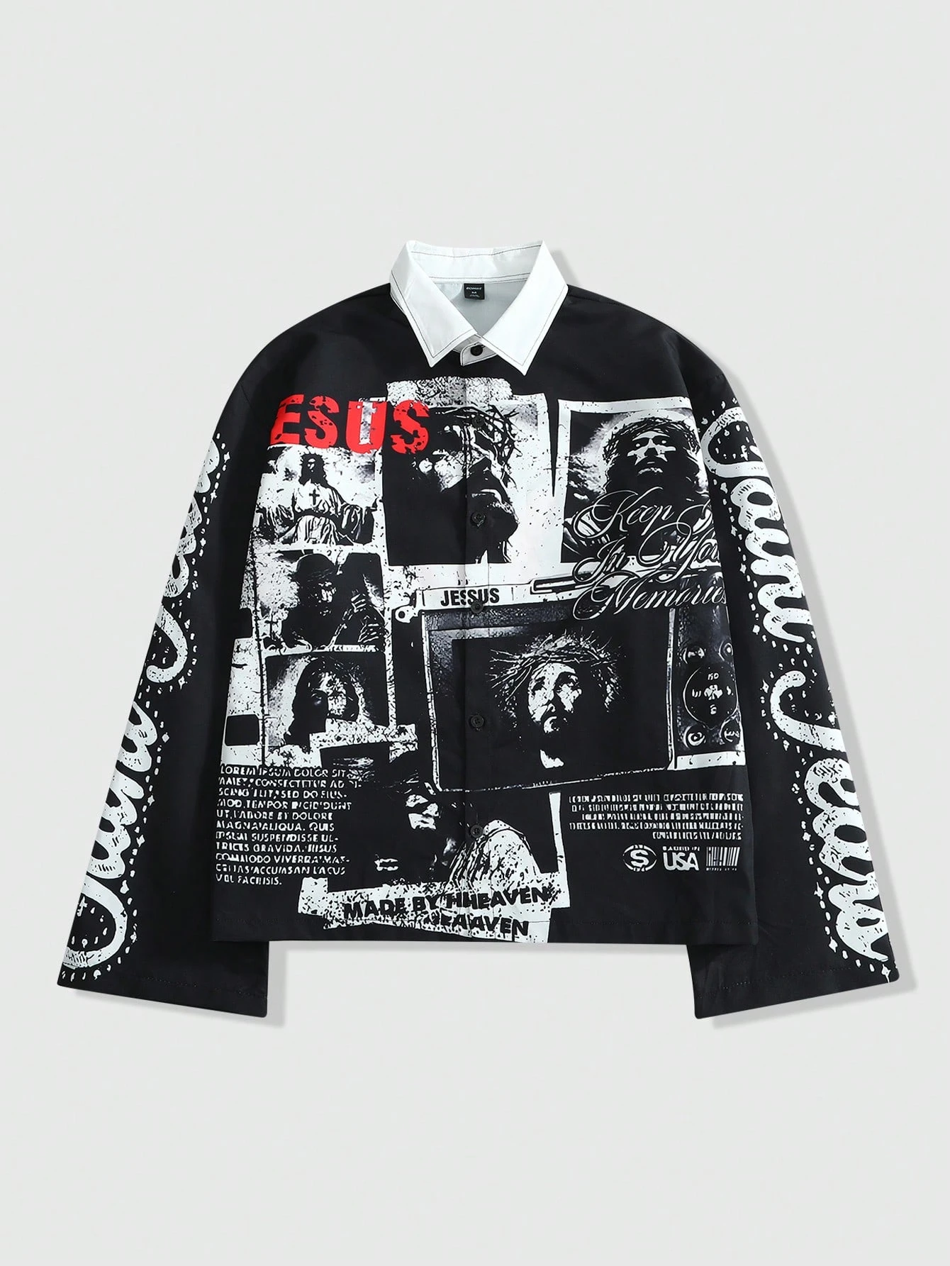 Street Life Chemise à manches longues pour hommes, design patchwork religieux Jésus et foi, convient pour le port casual quotidien, les sorties de rue et les rassemblements, parfait pour les hommes à la mode