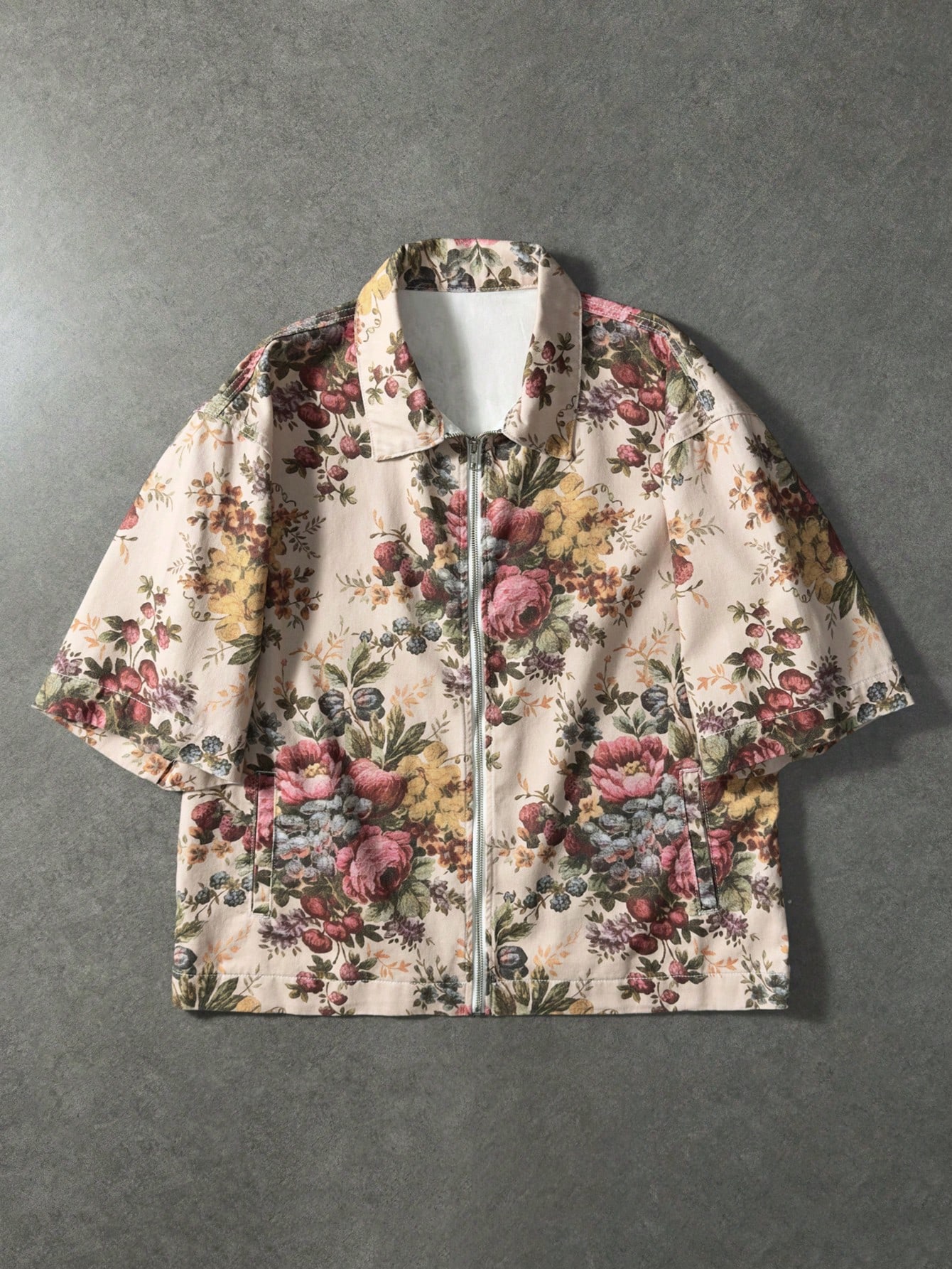 Casual Veste en jean décontractée à manches courtes avec fermeture éclair et imprimé floral pour hommes